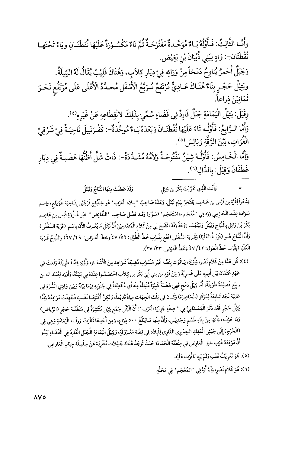وأما الثَّالِثُ: فأوله باء مُوْحَّدَة مَفْتُوحةٌ ثُمَّ تاء مَكْسُورَة عليها نُقْطَتَان وياء تَحْتَهَا نُقْطَتَان -: واد لبني ذبيان بن بغيض.