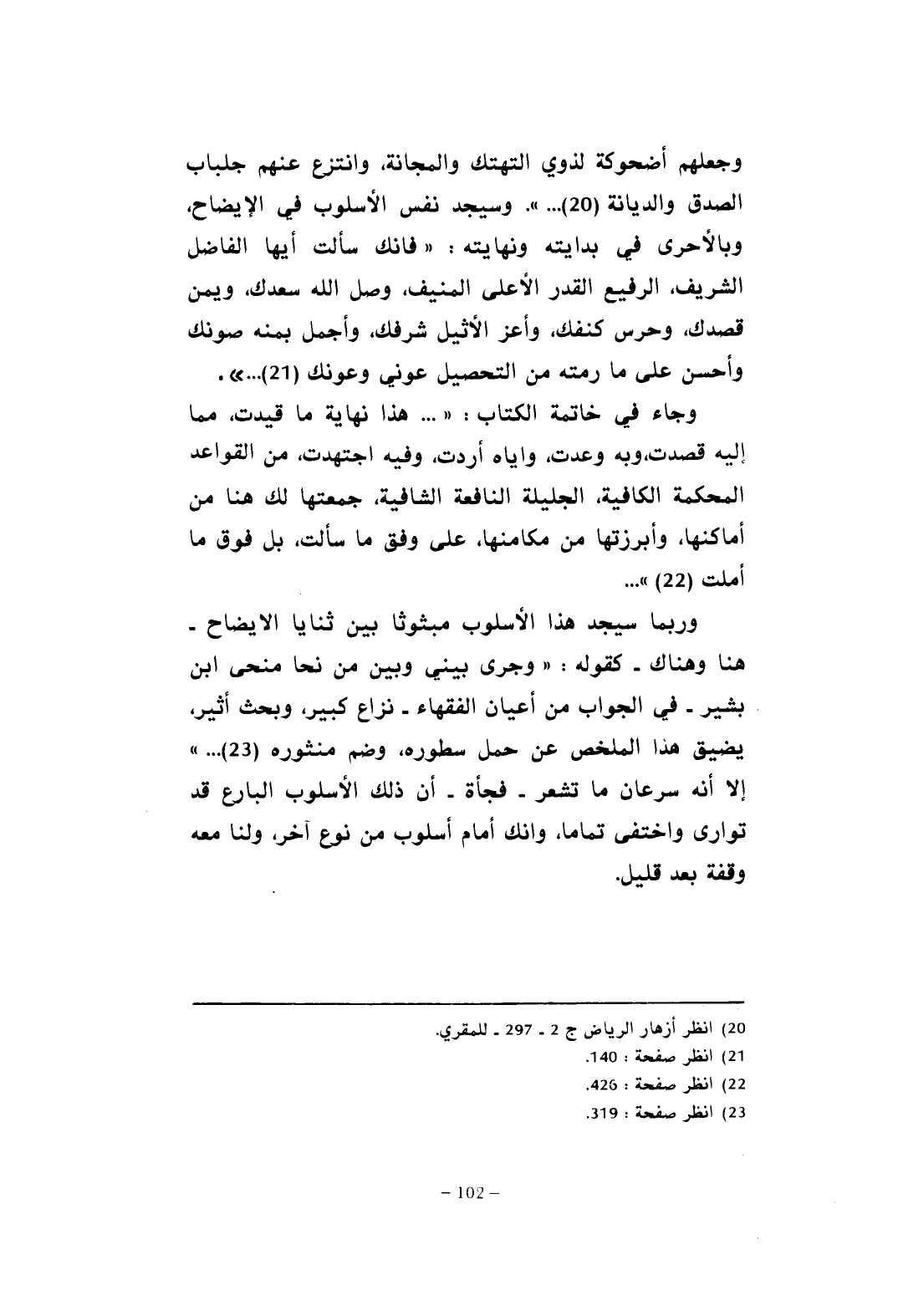 وجعلهم أضحوكة لذوي التهتك والمجانة، وانتزع عنهم جلباب الصدق والديانة (¬20) ... ". وسيجد نفس الأسلوب في الإيضاح، وبالأحرى في بدايته ونهايته: "فإنك سألت أيها الفاضل الشريف، الرفيع القدر الأعلى المنيف، وصل الله سعدك، ويمن قصدك، وحرس كنفك، وأعز الأثيل شرفك، وأجمل بمنه صونك وأحسن على ما رمته من التحصيل عوني وعونك (¬21) ... ".