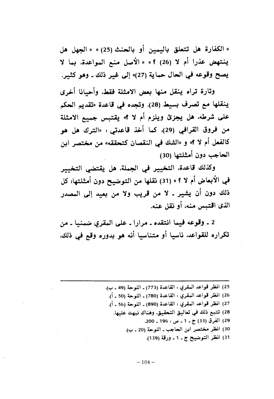 وتارة تراه ينقل منها بعض الأمثلة فقط، وأحيانًا أخرى ينقلها مع تصرف بسيط (¬28). وتجده في قاعدة "تقديم الحكم على شرطه، هل يجزئ ويلزم أم لا؟ " يقتبس جميع الأمثلة من فروق القرافي (¬29)، كما أخذ قاعدة: "الترك هل هو كالفعل أم لا؟ " و"الشك في النقصان كتحققه" من مختصر ابن الحاجب دون أمثلتها (¬30).