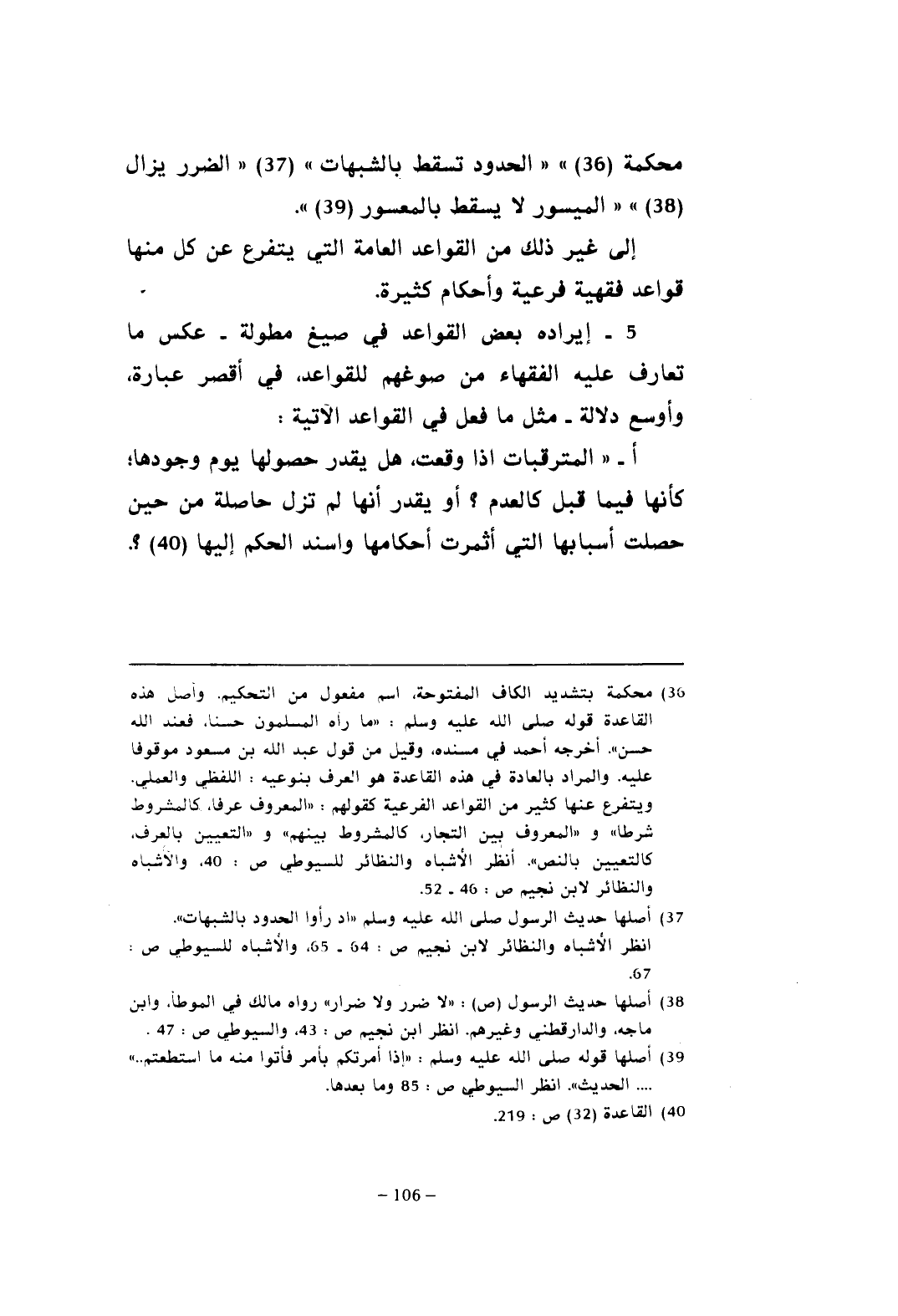 محكمة (¬36) " "الحدود تسقط بالشبهات" (¬37) "الضرر يزال (¬38) " "الميسور لا يسقط بالمعسور (¬39) ".