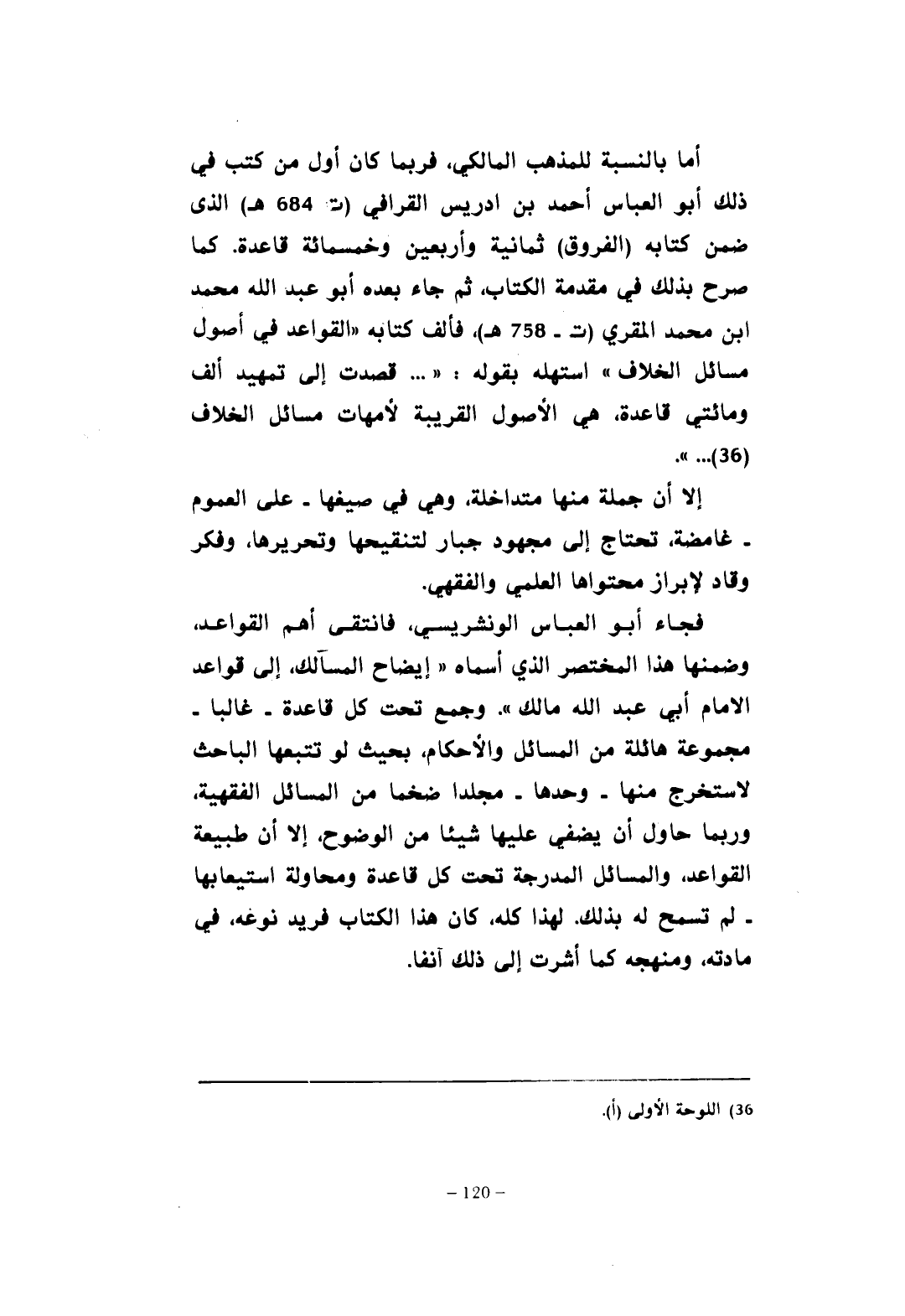 أما بالنسبة للمذهب المالكي، فربما كان أول من كتب في ذلك أبو العباس أحمد بن إدريس القرافي (ت 684 هـ) الَّذي ضمن كتابه (الفروق) ثمانية وأربعين وخمسمائة قاعدة. كما صرح بذلك في مقدمة الكتاب، ثم جاء بعده أبو عبد الله محمد بن محمد المقري (ت - 758 هـ)، فألف كتابه "القواعد في أصول مسائل الخلاف" استهله بقوله: " ... قصدت إلى تمهيد ألف ومائتي قاعدة، هي الأصول القريبة لأمهات مسائل الخلاف (¬36) ... ".