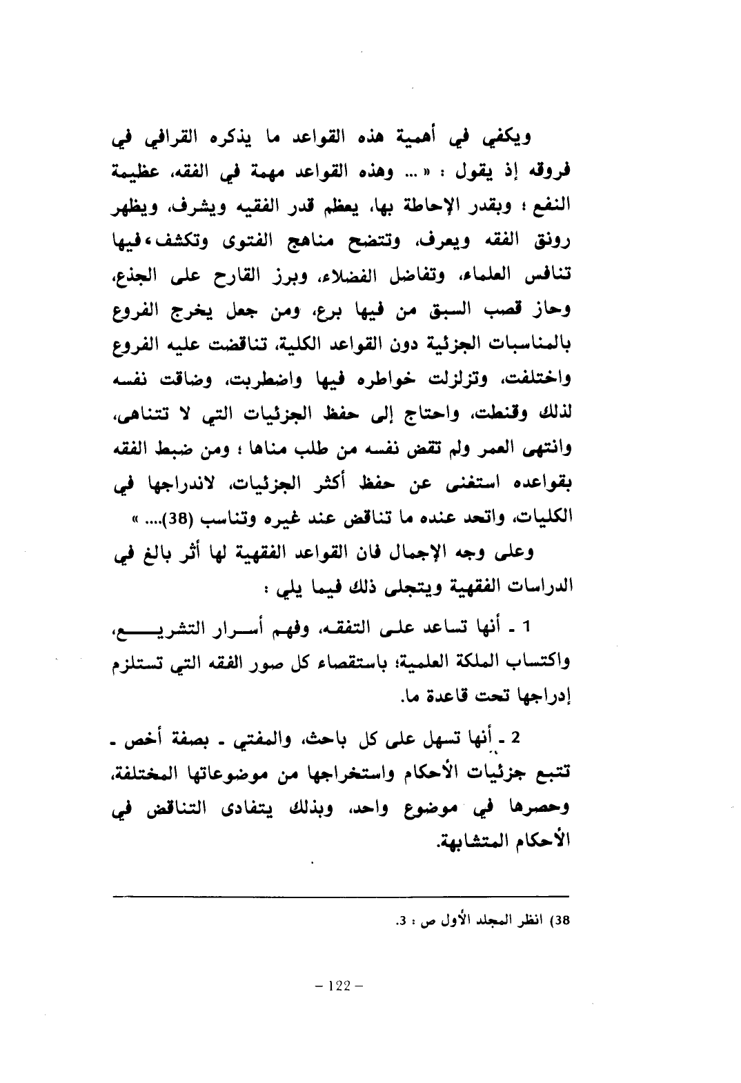 ويكفي في أهمية هذه القواعد ما يذكره القرافي في فروقه إذ يقول: " ... وهذه القواعد مهمة في الفقه، عظيمة النفع؛ وبقدر الإحاطة بها، يعظم قدر الفقيه ويشرف، ويظهر رونق الفقه ويعرق، وتتضح مناهج الفتوى وتكشف، فيها تنافس العلماء، وتفاضل الفضلاء، وبرز القارح على الجذع، وحاز قصب السبق من فيها برع، ومن جعل يخرج الفروع بالمناسبات الجزئية دون القواعد الكلية، تناقضت عليه الفروع واختلفت، وتزلزلت خواطره فيها واضطربت، وضاقت نفسه لذلك وقنطت، واحتاج إلى حفظ الجزئيات التي لا تتناهى، وانتهى العمر ولم تقض نفسه من طلب مناها: ومن ضبط الفقه بقواعده استغنى عن حفظ أكثر الجزئيات، لاندراجها في الكليات، واتحد عنده ما تناقض عند غيره وتناسب (¬38) ... ".