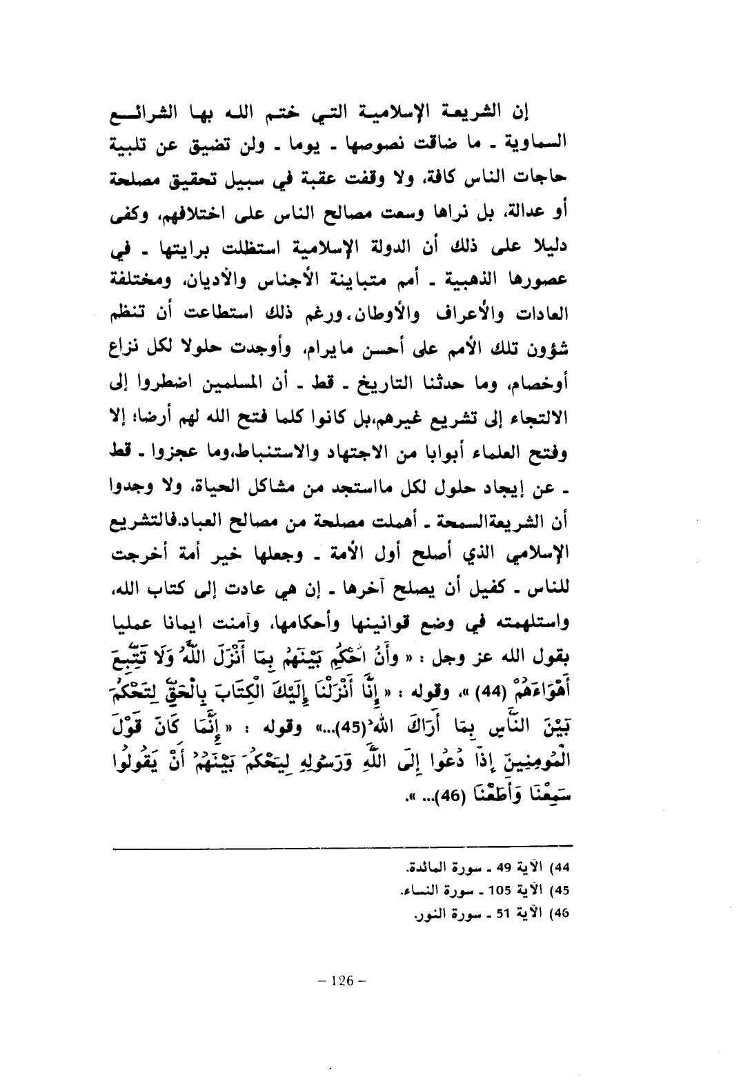 إن الشريعة الإسلامية التي ختم الله بها الشرائع السماوية - ما ضاقت نصوصها - يوما - ولن تضيق عن تلبية حاجات الناس كافة، ولا وقفت عقبة في سبيل تحقيق مصلحة أو عدالة، بل نراها وسعت مصالح الناس على اختلافهم، وكفى دليلا على ذلك أن الدولة الإسلامية استظلت برايتها - في عصورها الذهبية - أمم متباينة الأجناس والأديان، ومختلفة العادات والأعراف والأوطان، ورغم ذلك استطاعت أن تنظم شؤون تلك الأمم على أحسن ما يرام، وأوجدت حلولا لكل نزاع أو خصام، وما حدثنا التاريخ - قط - أن المسلمين اضطروا إلى الالتجاء إلى تشريع غيرهم، بل كانوا كلما فتح الله لهم أرضا؛ إلا وفتع العلماء أبوابا من الاجتهاد والاستنباط، وما عجزوا - قط - عن إيجاد حلول لكل ما استجد من مشاكل الحياة، ولا وجدوا أن الشريعة السمحة - أهملت مصلحة من مصالح العباد. فالتشريع الإسلامي الَّذي أصلح أول الأمة - وجعلها خير أمة أخرجت للناس - كفيل أن يصلح آخرها - إن هي عادت إلى كتاب الله، واستلهمته في وضع قوانينها وأحكامها، وآمنت إيمانا عمليا بقول الله عَزَّ وَجَلَّ: {وَأَنِ احْكُمْ بَينَهُمْ بِمَا أَنْزَلَ اللَّهُ وَلَا تَتَّبِعْ أَهْوَاءَهُمْ} (¬44) "، وقوله: {إِنَّا أَنْزَلْنَا إِلَيكَ الْكِتَابَ بِالْحَقِّ لِتَحْكُمَ بَينَ النَّاسِ بِمَا أَرَاكَ اللَّهُ} (¬45) ... " وقوله: " {إِنَّمَا كَانَ قَوْلَ الْمُؤْمِنِينَ إِذَا دُعُوا إِلَى اللَّهِ وَرَسُولِهِ لِيَحْكُمَ بَينَهُمْ أَنْ يَقُولُوا سَمِعْنَا وَأَطَعْنَا} (¬46) ... ".