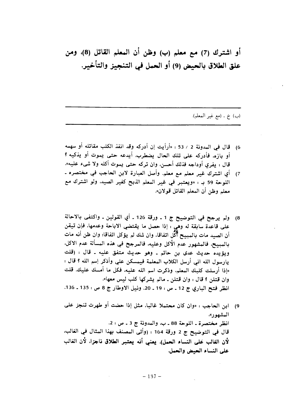(¬7) أي اشترك غير معلم مع معلم. وأصل العبارة لابن الحاجب في مختصره - اللوحة 59 ب: "ويعتبر في غير المعلم الذبح كغير الصيد، ولو اشترك مع معلم وظن أن المعلم القاتل قولان".