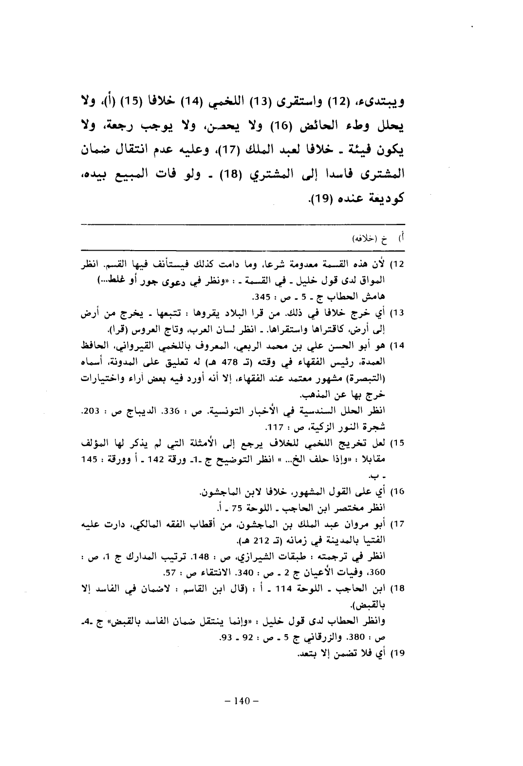 (¬14) هو أبو الحسن علي بن محمد الربعي، المعروف باللخمي القيرواني، الحافظ العمدة، رئيس الفقهاء في وقته (ت 478 هـ) له تعليق على المدونة، أسماه (التبصرة) مشهور معتمد عند الفقهاء، إلا أنه أورد فيه بعض آراء واختيارات خرج بها عن المذهب.