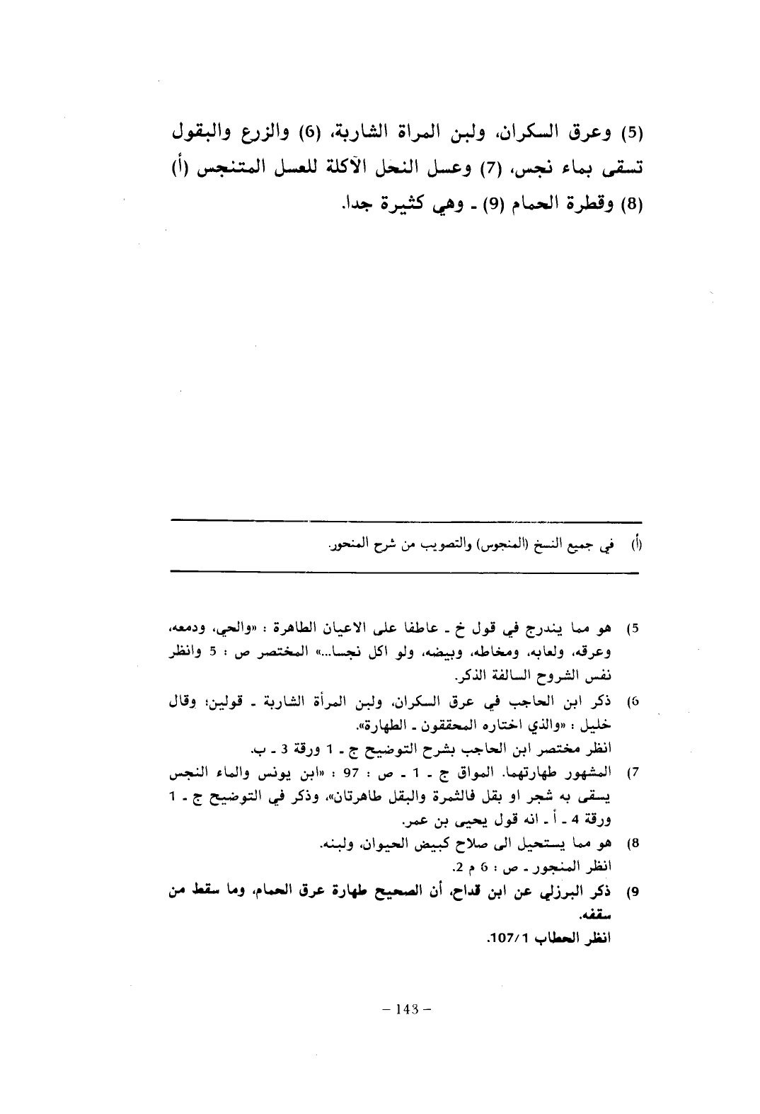(¬6) ذكر ابن الحاجب في عرق السكران، ولبن المرأة الشاربة - قولين؛ وقال خليل: "والذي اختاره المحققون - الطهارة".
