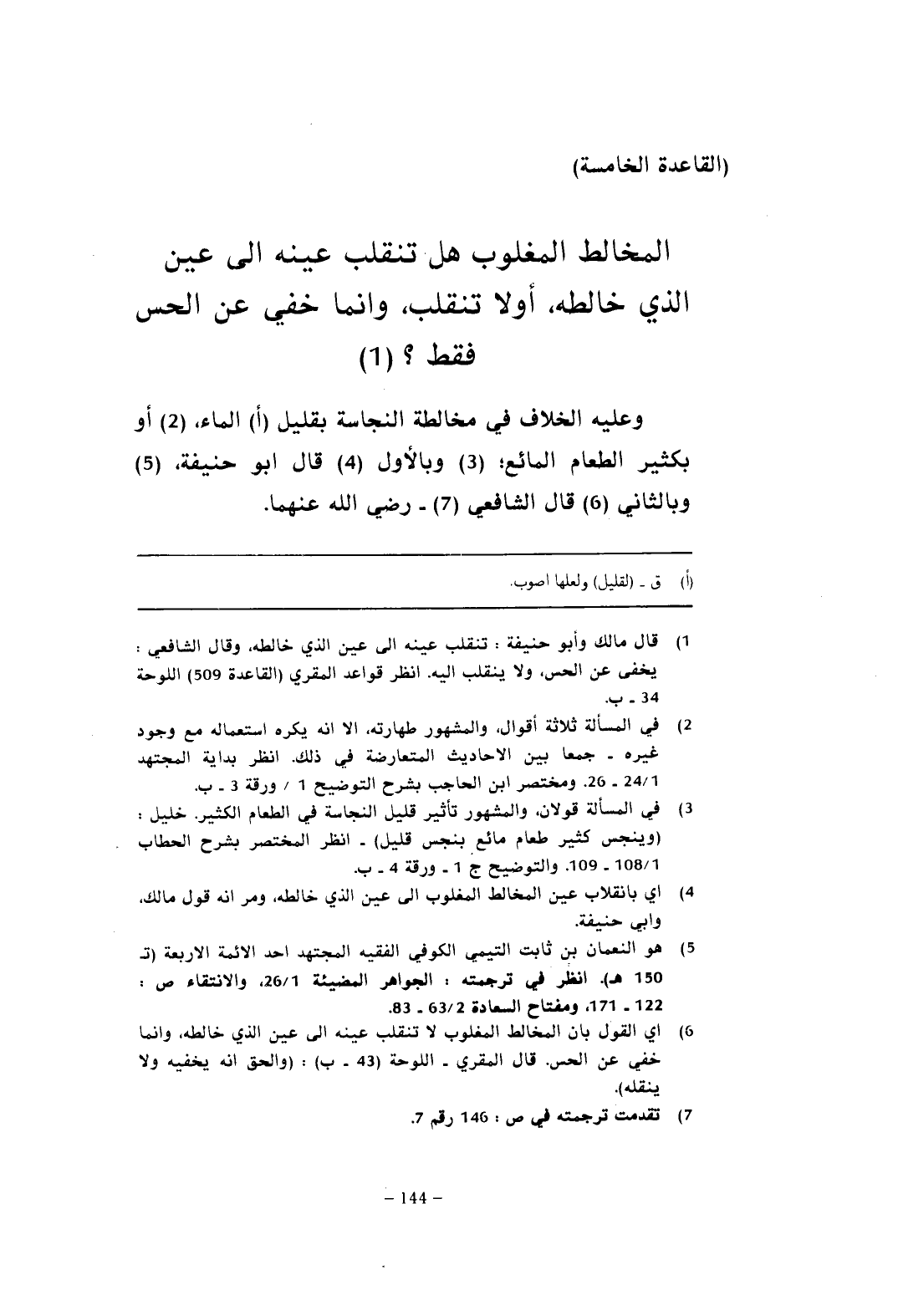 (¬1) قال مالك وأبو حنيفة: تنقلب عينه إلى عين الذي خالطه، وقال الشافعي: يخفى عن الحس، ولا ينقلب إليه. انظر قواعد المقري (القاعدة 509) اللوحة 34 - ب.
