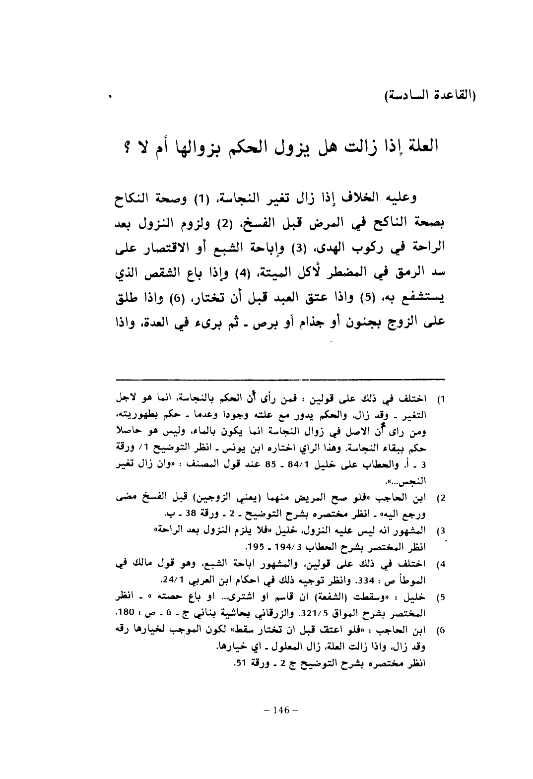 (القاعدة السادسة) العلة إذا زالت هل يزول الحكم بزوالها أم لا؟