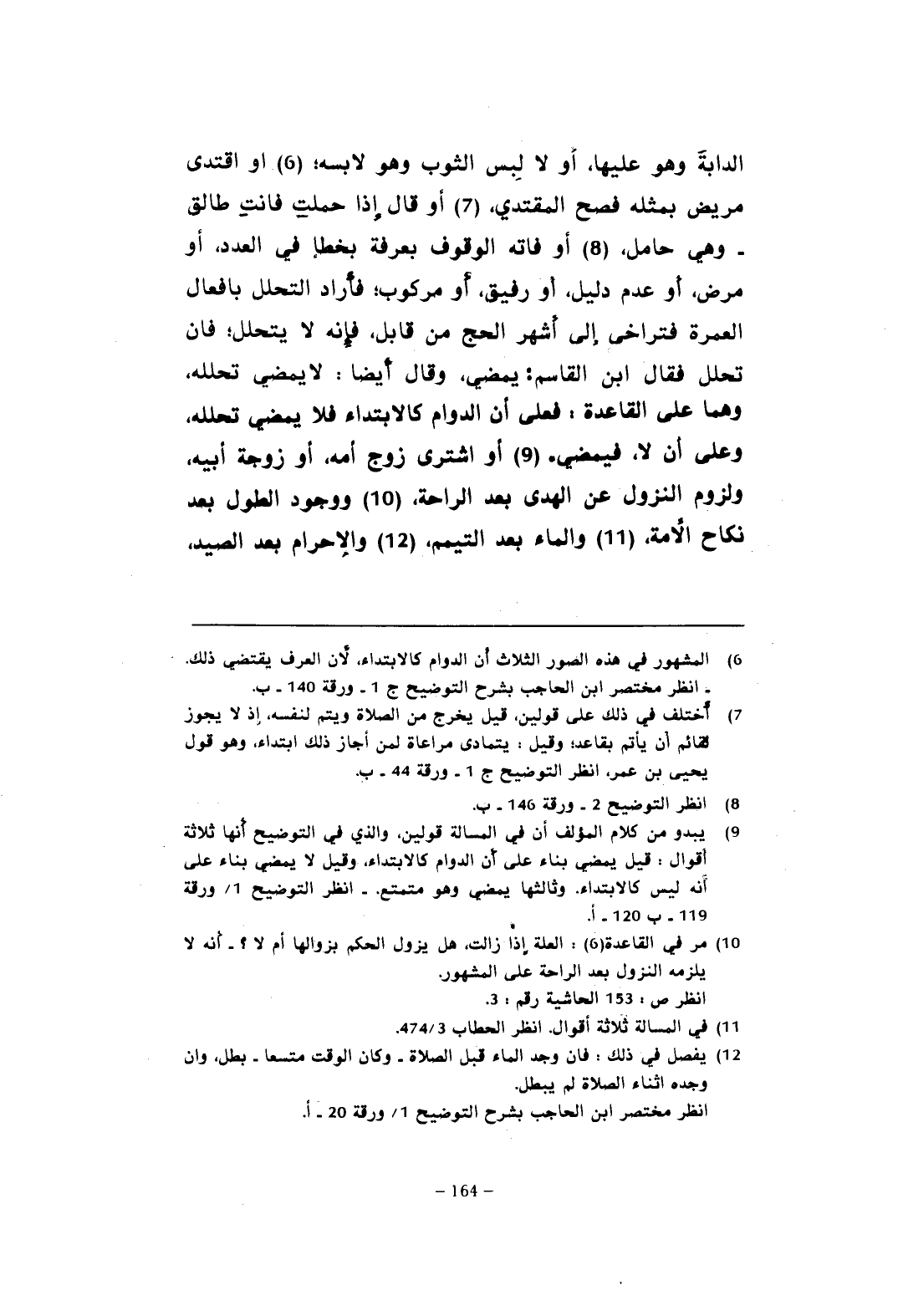 الدابةَ وهو عليها، أو لا لِبس الثوب وهو لابسه؛ (¬6) أو اقتدى مريض بمثله فصح المقتدي، (¬7) أو قال إذا حملت فأنت طالق - وهي حامل، (¬8) أو فاته الوقوف بعرفة بخطإ في العدد، أو مرض، أو عدم دليل، أو رفيق، أو مركوب؛ فأراد التحلل بأفعال العمرة فتراخى إلى أشهر الحج من قابل، فإنه لا يتحلل؛ فإن تحلل فقال ابن القاسم: يمضي، وقال أيضًا: لا يمضي تحلله، وهما على القاعدة: فعلى أن الدوام كالابتداء فلا يمضي تحلله، وعلى أن لا، فيمضي. (¬9) أو اشترى زوج أمه، أو زوجة أبيه، ولزوم النزول عن الهدى بعد الراحة، (¬10) ووجود الطول بعد نكاح الأمة، (¬11) والماء بعد التيمم، (¬12)