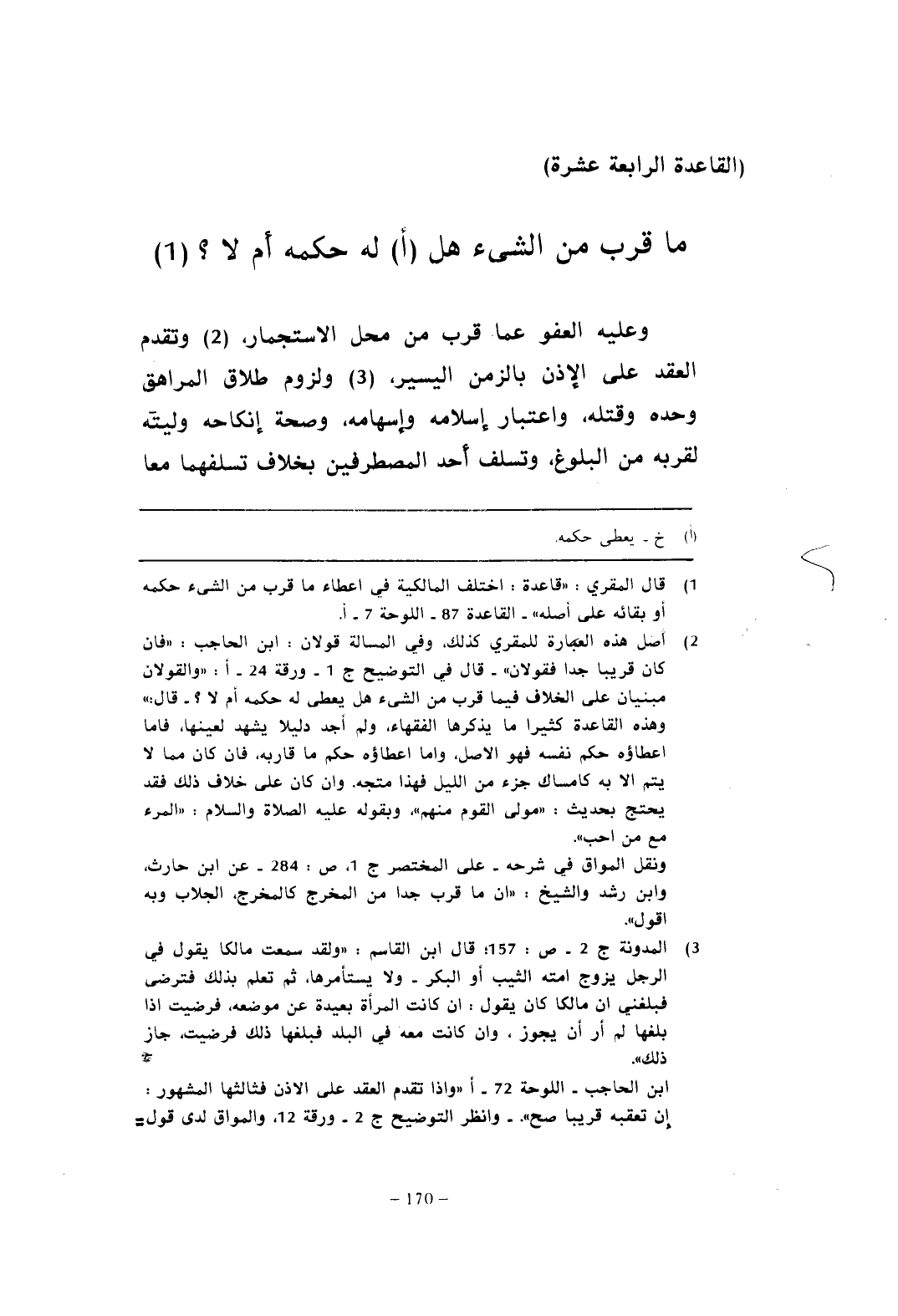 (¬1) قال المقري: "قاعدة: اختلف المالكية في إعطاء ما قرب من الشيء حكمه أو بقائه على أصله" - القاعدة 87 - اللوحة 7 - أ.