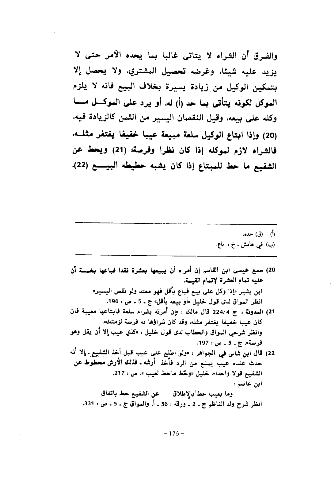 (¬22) قال ابن شاس في الجواهر: "ولو اطلع على عيب قبل أخذ الشفيع - إلا أنه حدث عنده عيب يمنع من الرد فأخذ أرشه - فذلك الأرش محطوط عن الشفيع قولا واحدا". خليل "وحُط ما حط لعيب". ص: 217.