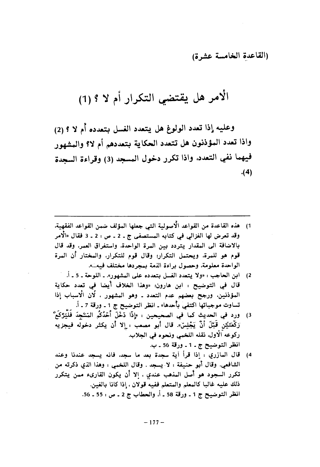 (¬1) هذه القاعدة من القواعد الأُصولية التي جعلها المؤلف ضمن القواعد الفقهية، وقد تعرض لها الغزالي في كتابه المستصفى ج -2 - ص: 2 - 3 فقال "الأمر بالإضافة إلى المقدار يتردد بين المرة الواحدة، واستغراق العمر، وقد قال قوم هو للمرة، ويحتمل التكرار وقال قوم للتكرار، والمختار أن المرة الواحدة معلومة، وحصول براءة الذمة بمجردها مختلف فيه ... ".