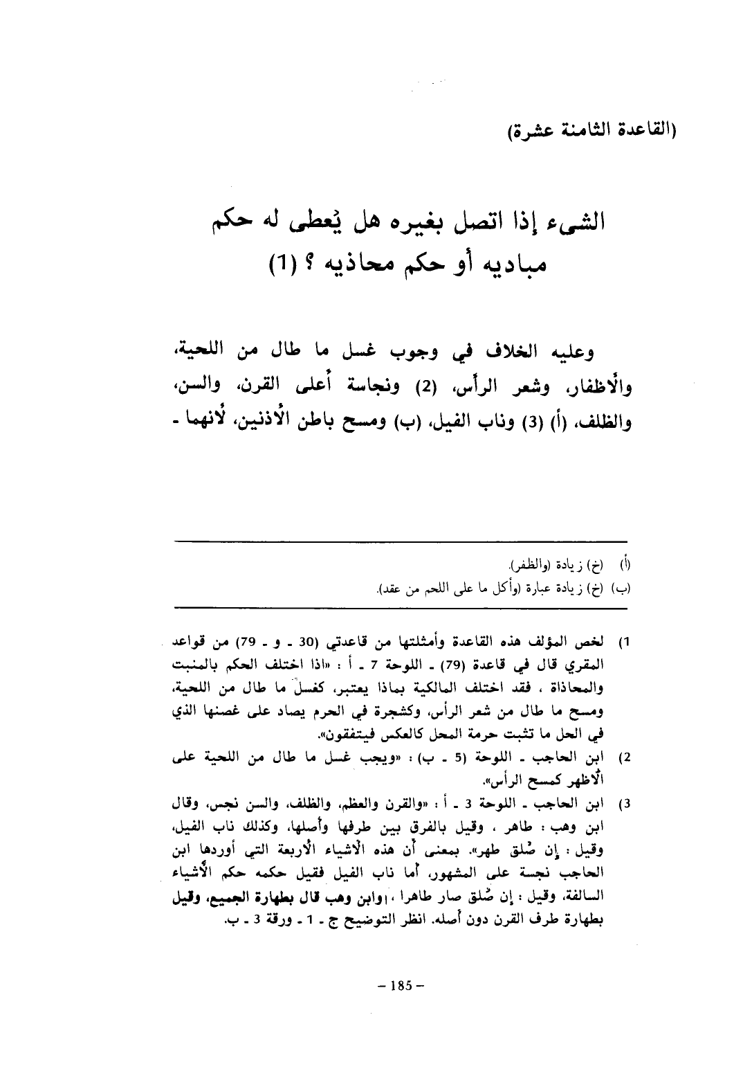 (القاعدة الثامنة عشرة) الشيء إذا اتصل بغيره هل يعطى له حكم مباديه أو حكم محاذيه؟ (¬1)