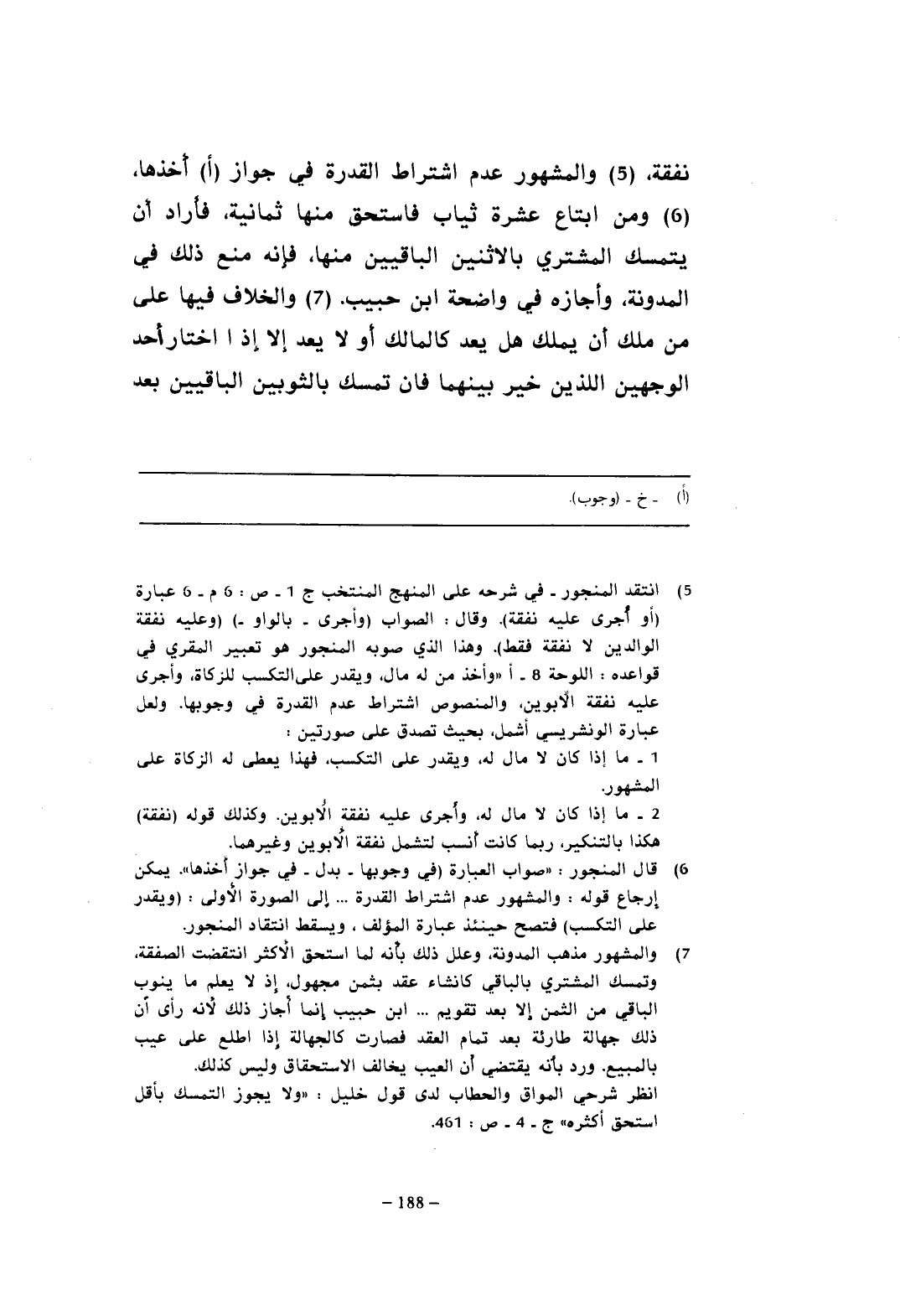 (¬5) انتقد المنجور - في شرحه على المنهج المنتخب ج 1 - ص: 6 م - عبارة (أو أجرى عليه نفقة). وقال: الصواب (وأجرى - بالواو -) (وعليه نفقة الوالدين لا نفقة فقط). وهذا الذي صوبه المنجور هو تعبير المقري في قواعده: اللوحة 8 - أ "وأخذ من له مال، ويقدر على التكسب للزكاة، وأجرى عليه نفقة الأبوين، والمنصوص اشتراط عدم القدرة في وجوبها. ولعل عبارة الونشريسي أشمل، بحيث تصدق على صورتين: