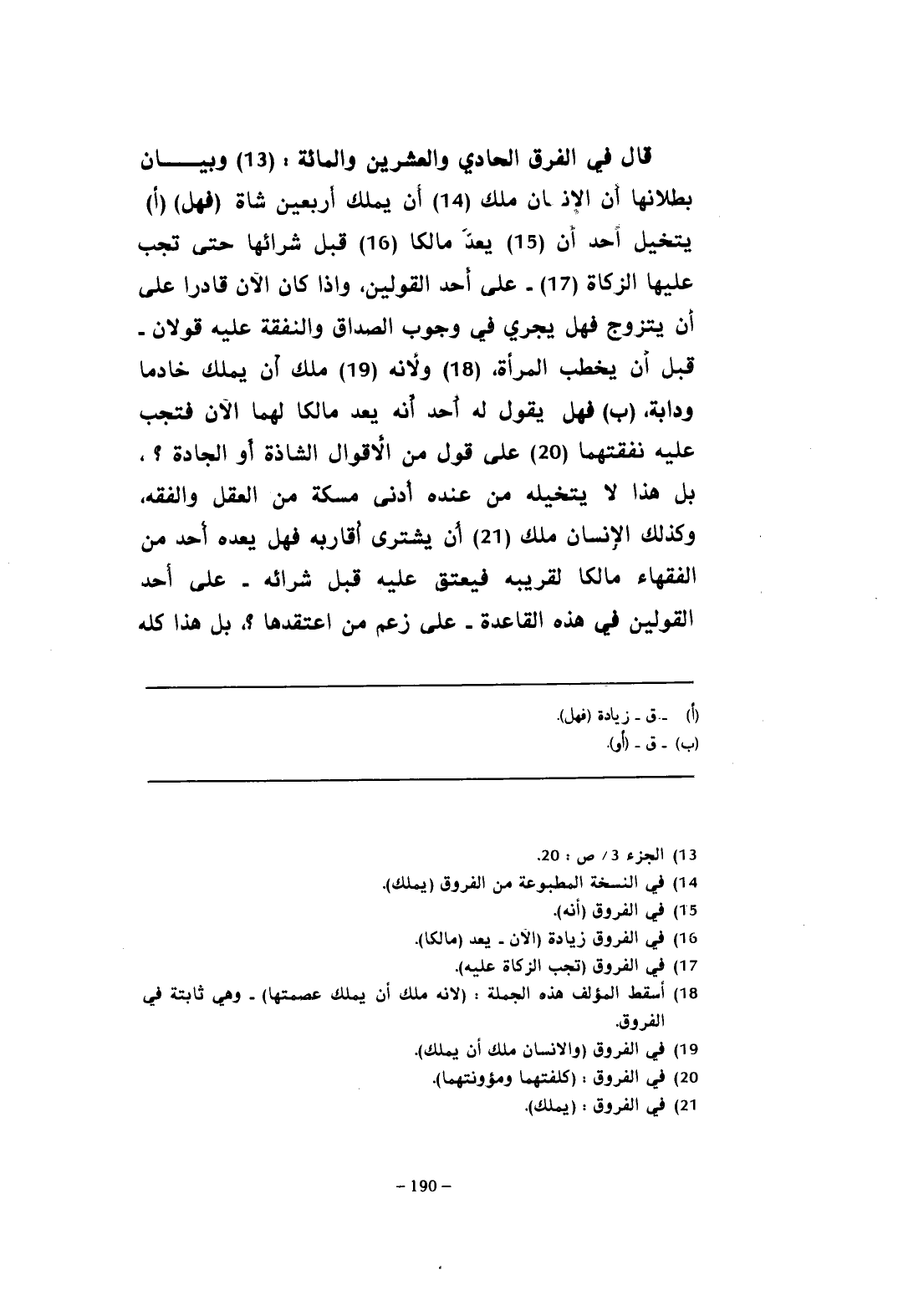 قال في الفرق الحادي والعشرين والمائة: (¬13) وبيان بطلانها أن الإنسان ملك (¬14) أن يملك أَربعين شاة (فهل) (أ) يتخيل أحد أن (¬15) يعدَّ مالكا (¬16) قبل شرائها حتى تجب عليها الزكاة (¬17) - على أحد القولين، وإذا كان الآن قادرا على أن يتزوج فهل يجري في وجوب الصداق والنفقة عليه قولان - قبل أن يخطب المرأة، (¬18) ولأنه (¬19) ملك أن يملك خادما ودابة، (ب) فهل يقول له أحد أنه يعد مالكا لهما الآن فتجب عليه نفقتهما (¬20) على قول من الأقوال الشاذة أو الجادة؟ ، بل هذا لا يتخيله من عنده أدنى مسكة من العقل والفقه، وكذلك الإنسان ملك (¬21) أن يشترى أقاربه فهل يعده أحد من الفقهاء مالكا لقريبه فيعتق عليه قبل شرائه - على أحد القولين في هذه القاعدة - على زعم من اعتقدها؟ ، بل هذا كله