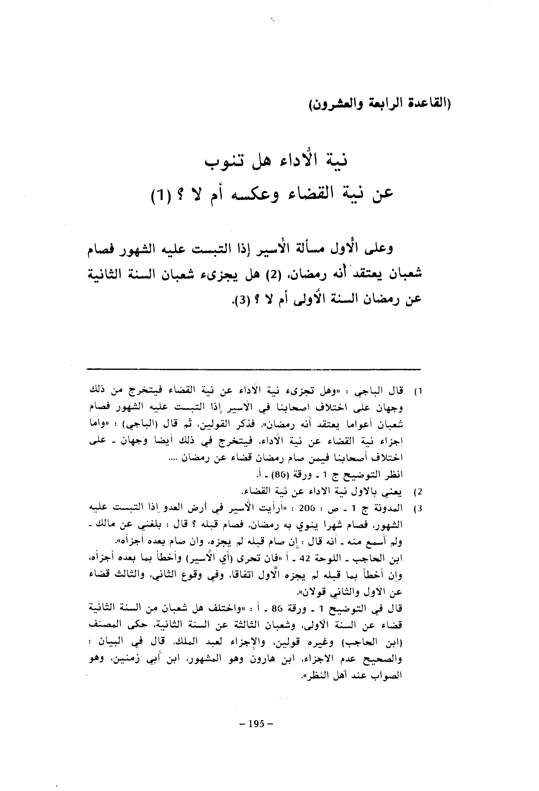قال في التوضيح 1 - ورقة 86 - أ: "واختلف هل شعبان من السنة الثانية قضاء عن السنة الأولى، وشعبان الثالثة عن السنة الثانية، حكى المصنف (ابن الحاجب) وغيره قولين، والإجزاء لعبد الملك. قال في البيان: والصحيح عدم الإجزاء، ابن هارون وهو المشهور، ابن أبي زمنين، وهو الصواب عند أهل النظر".