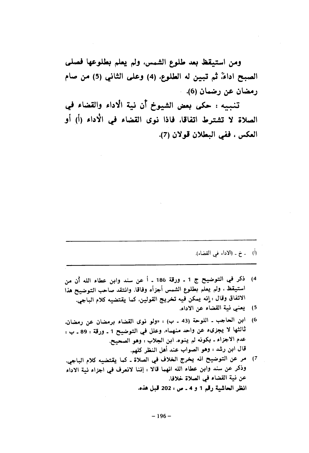 (¬4) ذكر في التوضيح ج 1 - ورقة 186 - أعن سند وابن عطاء الله أن من استيقظ، ولم يعلم بطلوع الشمس أجزأه وفاقا. وانتقد صاحب التوضيح هذا الاتفاق وقال: إنه يمكن فيه تخريج القولين، كما يقتضيه كلام الباجي.