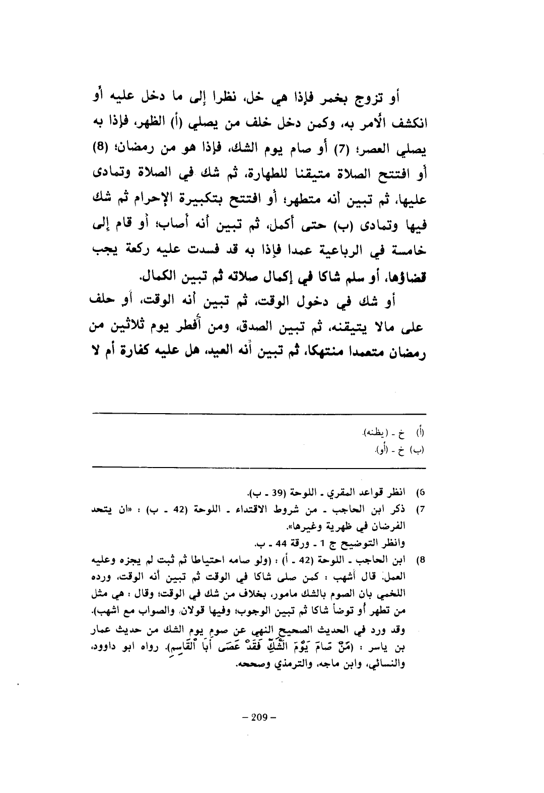(¬8) ابن الحاجب - اللوحة (42 - أ): (ولو صامه احتياطًا ثم ثبت لم يجزه وعليه العمل. قال أشهب: كمن صلى شاكا في الوقت ثم تبين أنه الوقت، ورده اللخمي بأن الصوم بالشك مأمور، بخلاف من شك في الوقت؛ وقال: هي مثل من تطهر أو توضأ شاكا ثم تبين الوجوب؛ وفيها قولان. والصواب مع أشهب).