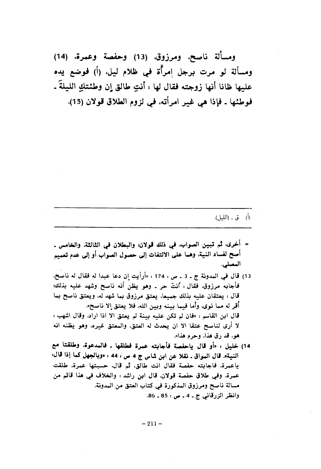(¬14) خليل: "أو قال يا حفصة فأجابته عمرة فطلقها - فالمدعوة، وطلقتا مع النية". قال المواق - نقلا عن ابن شاس ج 4 ص: 44: "وبالجهل كما إذا قال: يا عمرة، فأجابته حفصة فقال أنت طالق، ثم قال، حسبتها عمرة، طلقت عمرة، وفي طلاق حفصة قولان، قال ابن راشد: والخلاف في هذا قائم من مسألة ناصح ومرزوق المذكورة في كتاب العتق من المدونة.