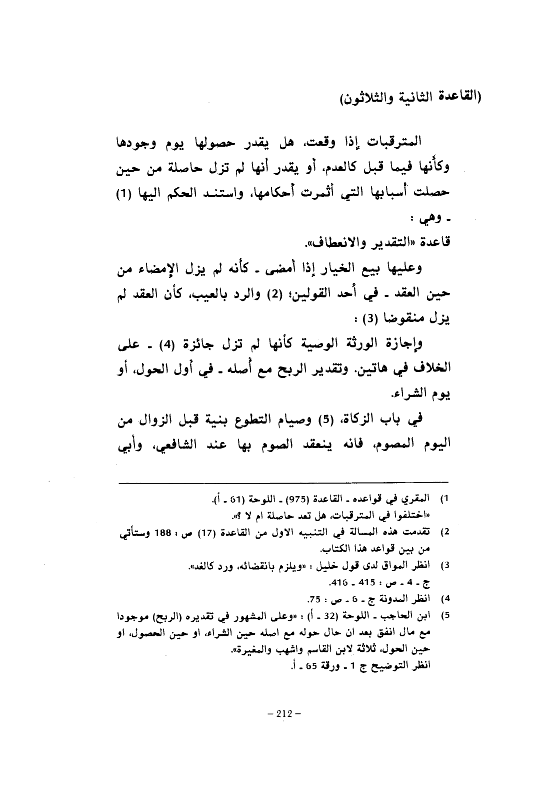 (القاعدة الثانية والثلاثون) المترقبات إذا وقعت، هل يقدر حصولها يوم وجودها وكأنها فيما قبل كالعدم، أو يقدر أنها لم تزل حاصلة من حين حصلت أسبابها التي أثمرت أحكامها، واستند الحكم إليها (¬1)