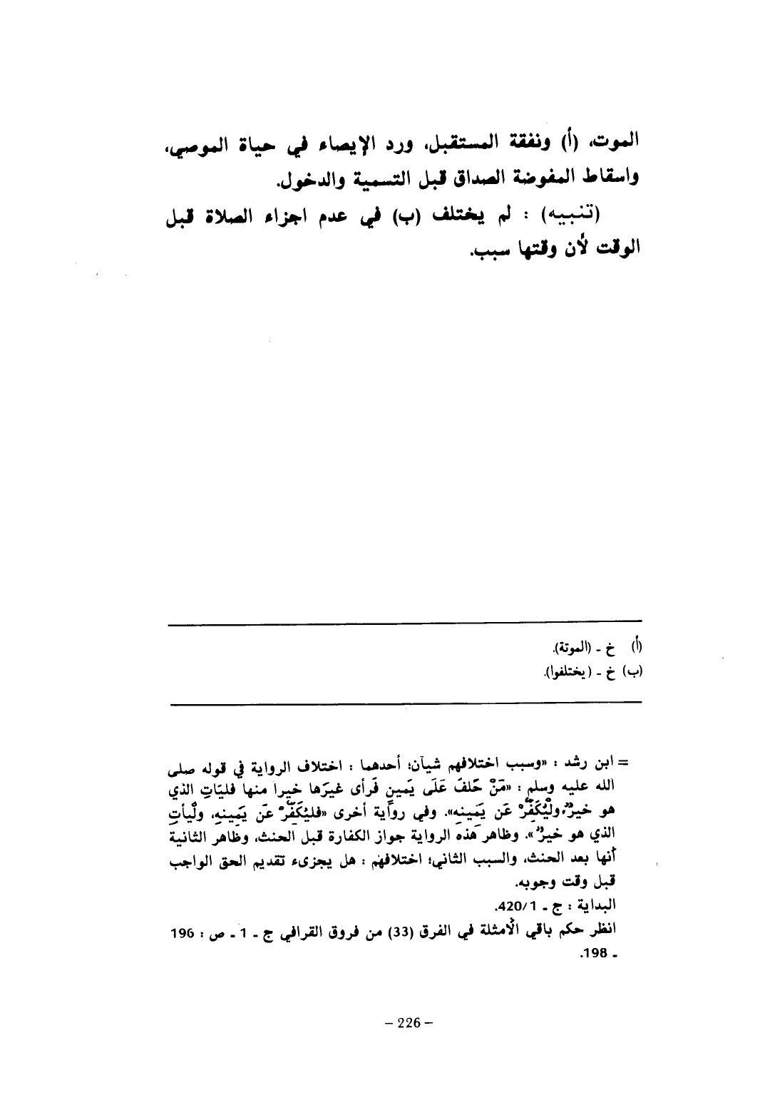 = ابن رشد: "وسبب اختلافهم شيئان: أحدهما: اختلاف الرواية في قوله صلى الله عليه وسلم: "مَنْ حَلفَ عَلَى يَمينٍ فَرأى غيرَها خيرا منها فليَأتِ الذي هو خيرٌ ولْيُكَفِّرْ عَن يَمِينه". وفي روَاية أخرى "فليُكَفِّرْ عَن يَمينهِ، ولْيأتِ الذي هو خيرٌ". وظاهر هذه الرواية جواز الكفارة قبل الحنث، وظَاهر الثانية أنها بعد الحنث، والسبب الثاني: اختلافهم: هل يجزئ تقديم الحق الواجب قبل وقت وجوبه.