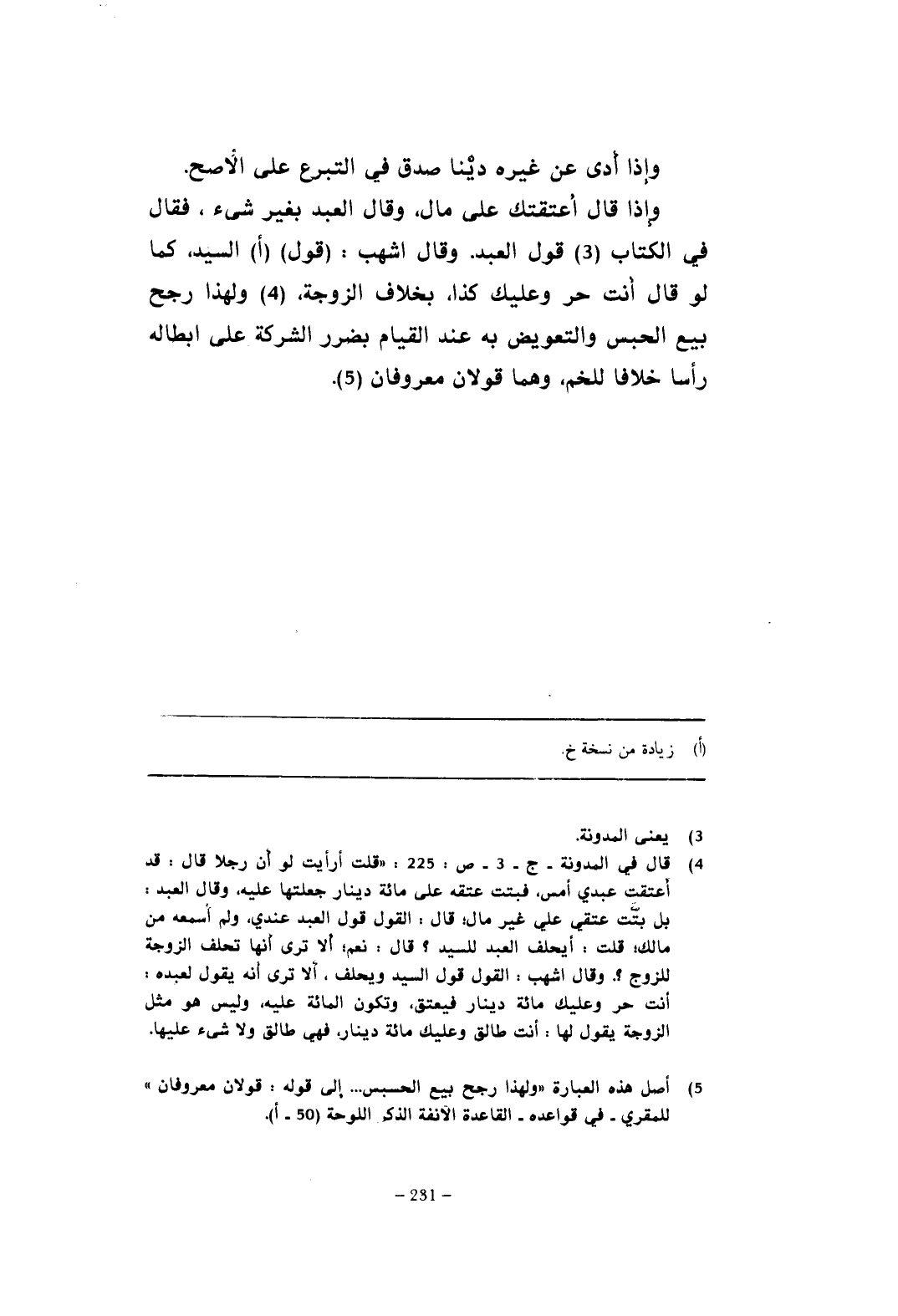 (¬4) قال في المدونة - ج - 3 - ص: 225: "قلت أرأيت لو أن رجلا قال: قد أعتقت عبدي أمس، فبتت عتقه على مائة دينار جعلتها عليه، وقال العبد: بل بتَّت عتقي علي غير مال؛ قال: القول قول العبد عندي، ولم أسمعه من مالك، قلت: أيحلف العبد للسيد؟ قال: نعم؛ ألا ترى أنها تحلف الزوجة للزوج؟ . وقال أشهب: القول قول السيد ويحلف، ألا ترى أنه يقول لعبده: أنت حر وعليك مائة دينار فيعتق، وتكون المائة عليه، وليس هو مثل الزوجة يقول لها: أنت طالق وعليك مائة دينار فهي طالق ولا شيء عليها.