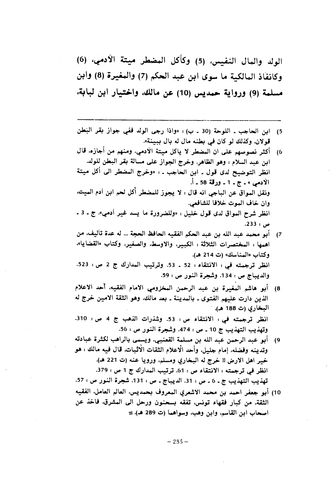 (¬6) أكثر نصوصهم على أن المضطر لا يأكل ميت الآدمي، ومنهم من أجازه، قال ابن عبد السلام: وهو الظاهر. وخرج الجواز، على مسألة بقر البطن للولد. انظر التوضيح لدى قول - ابن الحاجب -: "وخرج المضطر إلى أكل ميتة الآدمي" - ج - 1 - ورقة - أ.