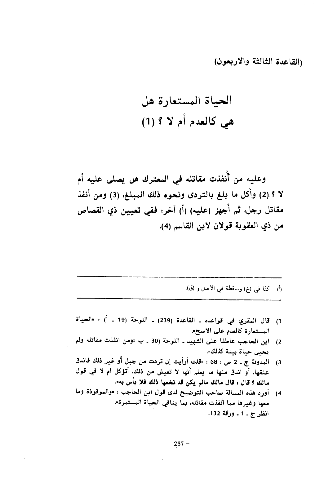 (¬1) قال المقري في قواعده - القاعدة (239) - اللوحة (19 - أ): "الحياة المستعارة كالعدم على الأصح".