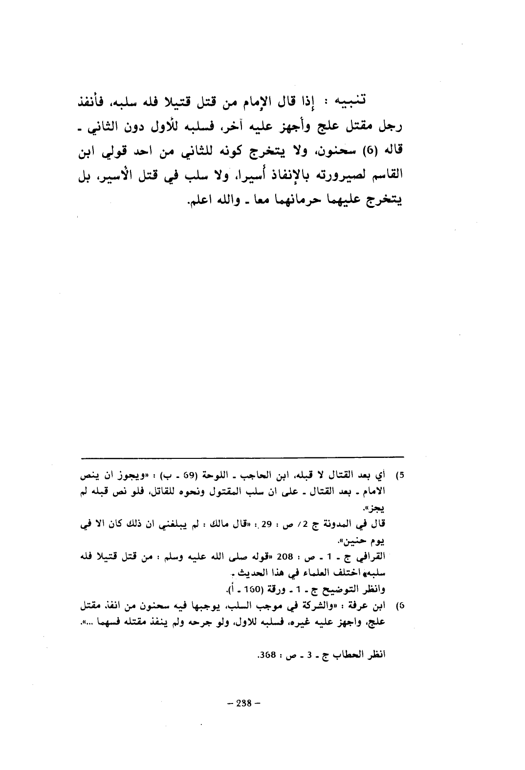 (¬6) ابن عرفة: "والشركة في موجب السلب، يوجبها فيه سحنون من أنفذ مقتل علج، وأجهز عليه غيره، فسلبه للأول، ولو جرحه ولم ينفذ مقتله فسهما ... ".