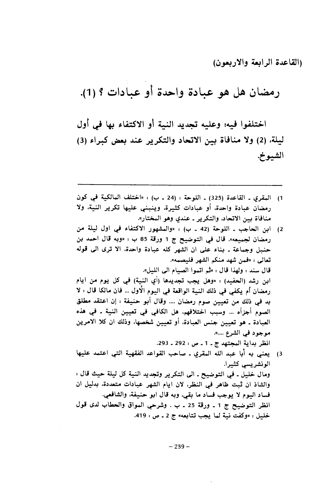 (¬1) المقري - القاعدة (325) - اللوحة: (24 - ب): "اختلف المالكية في كون رمضان عبادة واحدة، أو عبادات كثيرة، وينبني عليها تكرير النية، ولا منافاة بين الاتحاد, والتكرير - عندي وهو المختار".