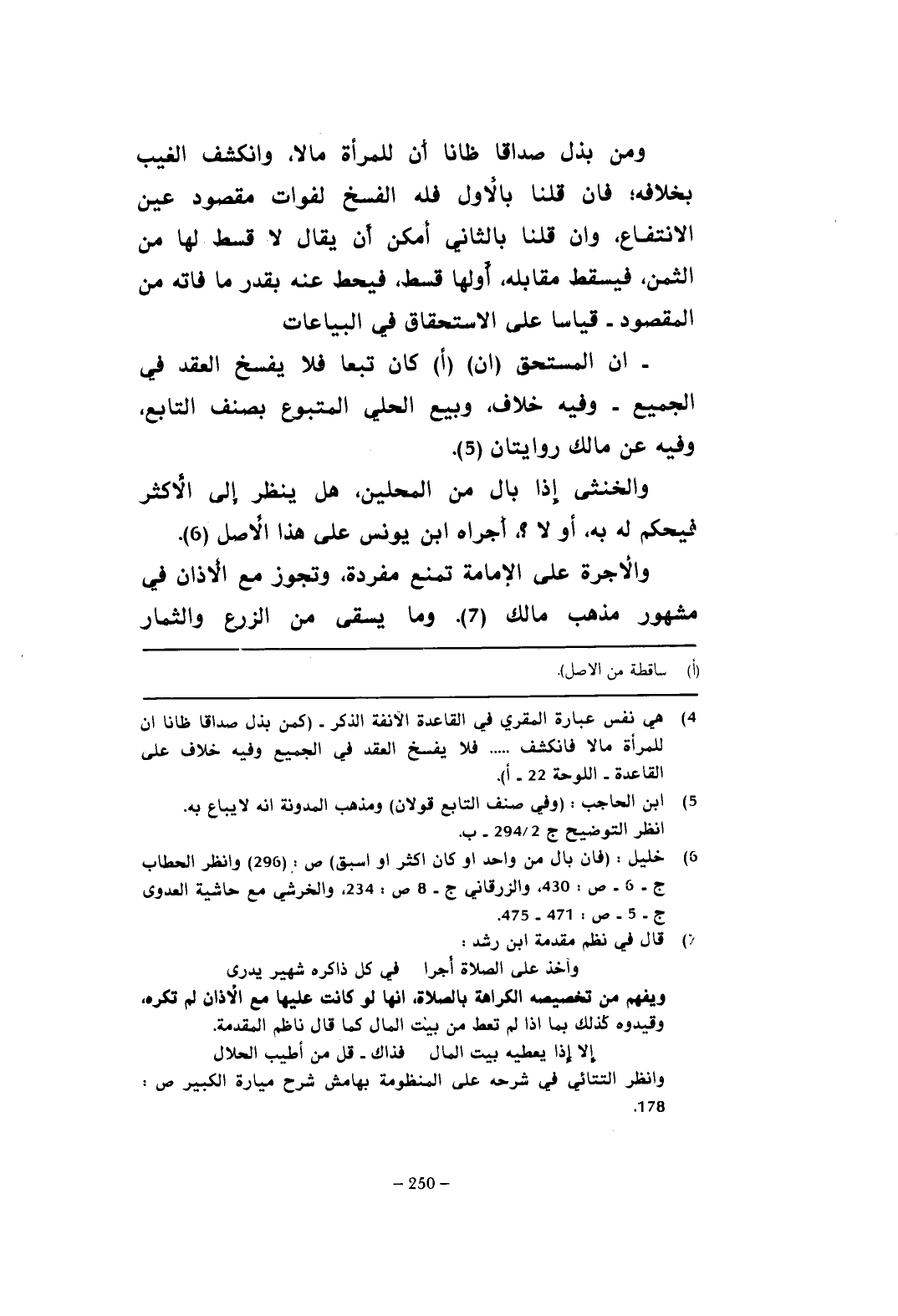 (¬4) هي نفس عبارة المقري في القاعدة الآنفة الذكر - (كمن بذل صداقا ظانا أن للمرأة مالا فانكشف. . فلا يفسخ العقد في الجميع وفيه خلاف على القاعدة - اللوحة 22 - أ).