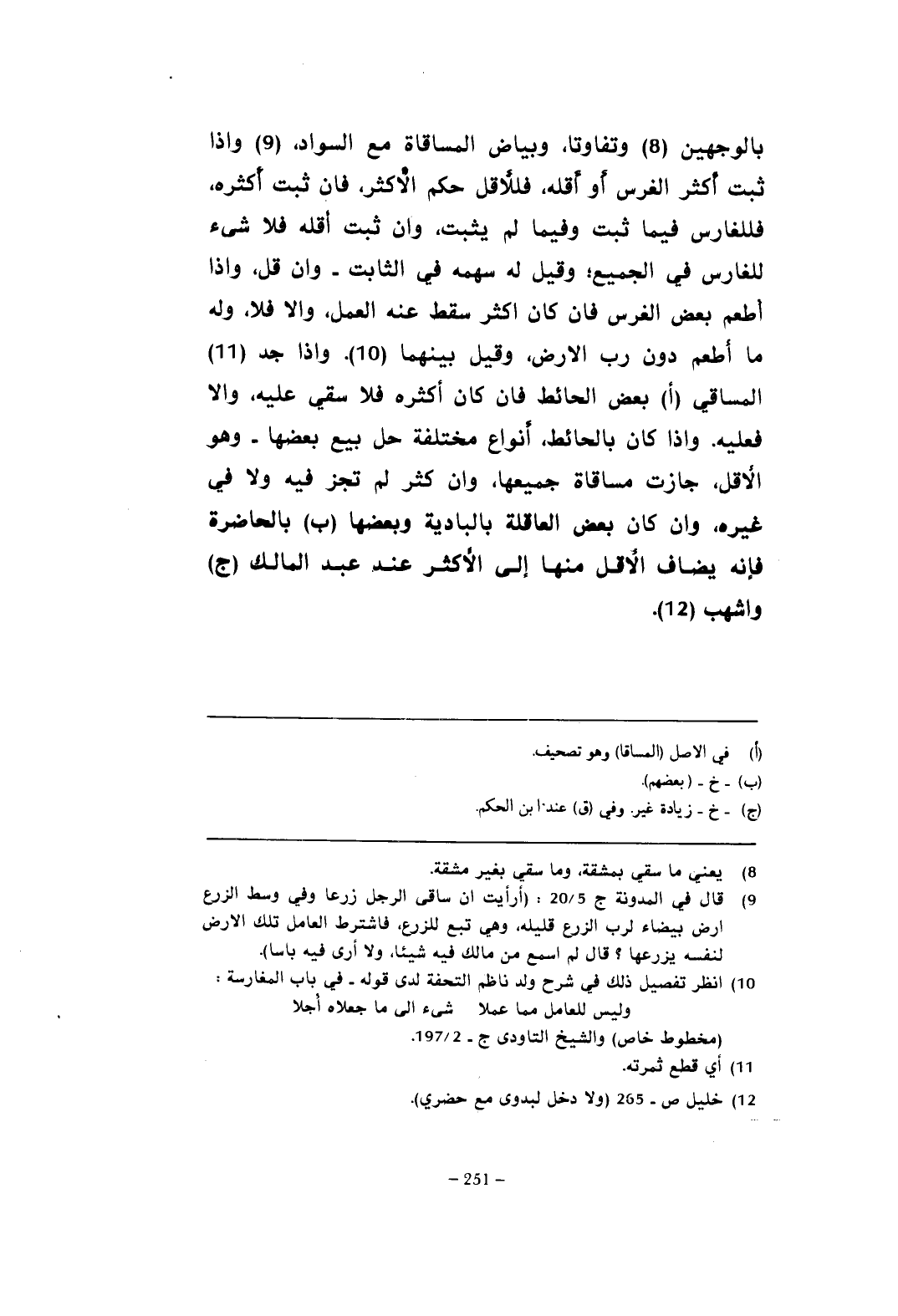 (¬9) قال في المدونة ج 5/ 20: (أرأيت أن ساقى الرجل زرعا وفي وسط الزرع أرض بيضاء لرب الزرع قليله، وهي تبع للزرع، فاشترط العامل تلك الأرض لنفسه يزرعها؟ قال لم أسمع من مالك فيه شيئًا، ولا أرى فيه بأسا).