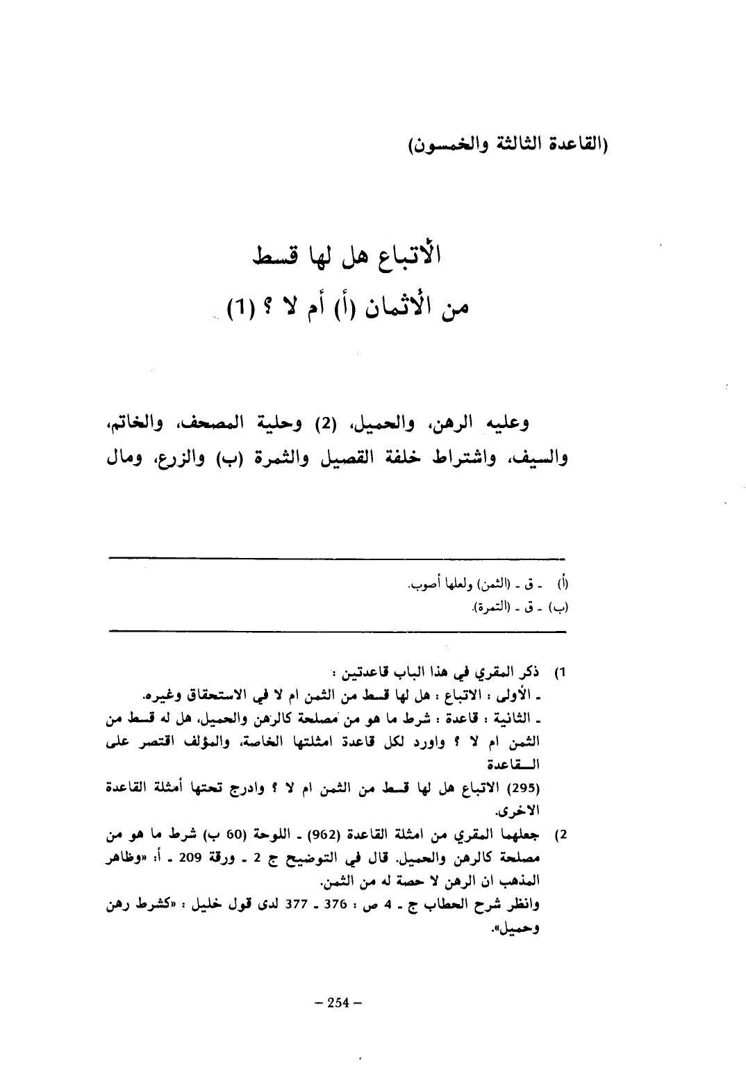 - الثانية: قاعدة: شرط ما هو من مصلحة كالرهن والحميل، هل له قسط من الثمن أم لا؟ وأورد لكل قاعدة أمثلتها الخاصة، والمؤلف اقتصر على القاعدة