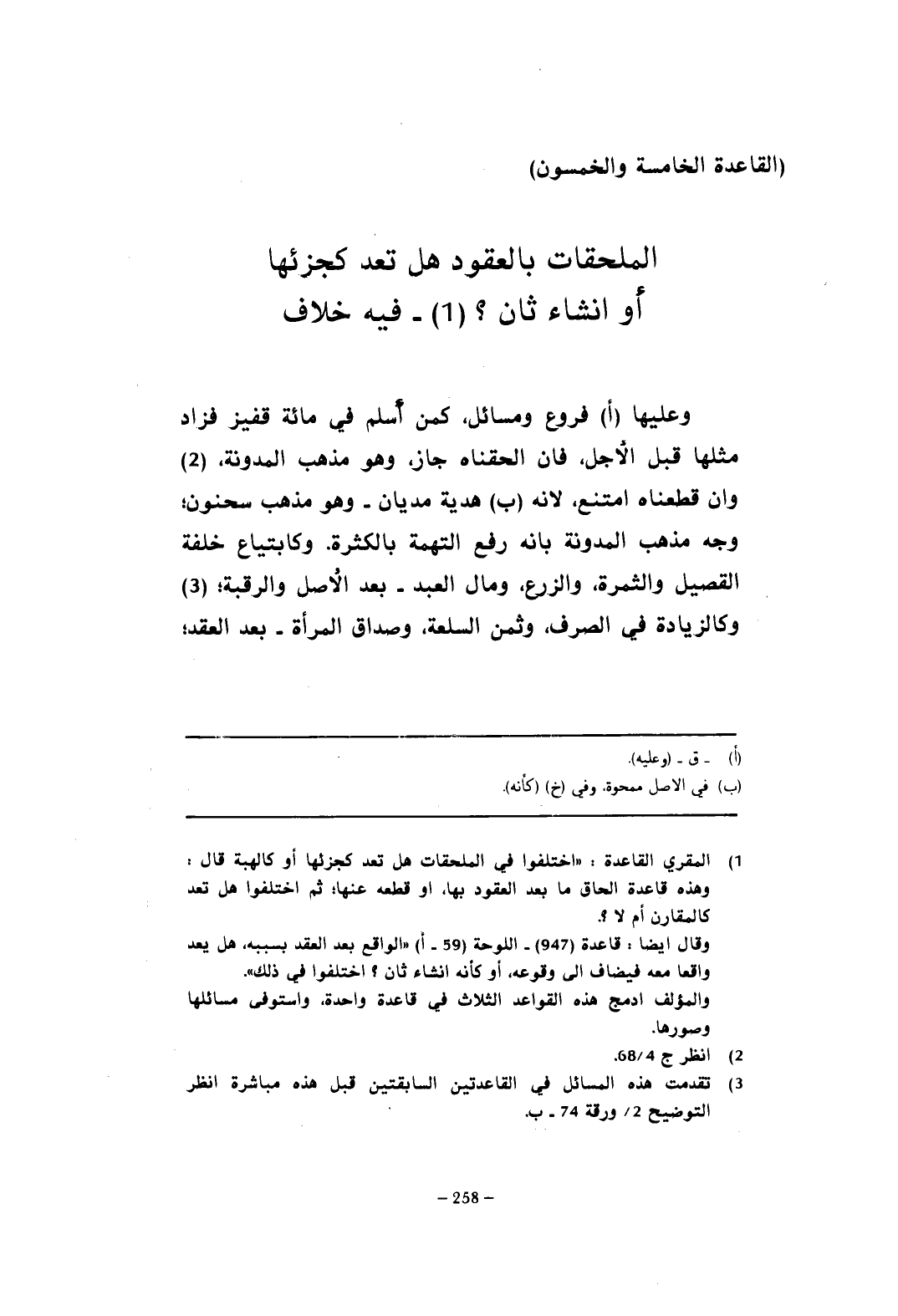 (¬1) المقري القاعدة: "اختلفوا في الملحقات هل تعد كجزئها أو كالهبة قال: وهذه قاعدة إلحاق ما بعد العقود بها، أو قطعه عنها؛ ثم اختلفوا هل تعد كالمقارن أم لا؟ .