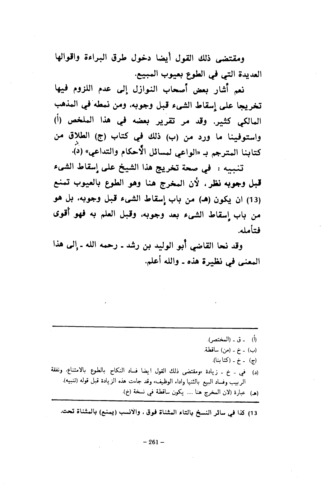(د) في -خ- زيادة "ومقتضى ذلك القول أيضًا فساد النكاح بالطوع بالامتناع. ونفقة الربيب وفساد البيع بالثنيا وأداء الوظيف" وقد جاءت هذه الزيادة قبل قوله (تنبيه).