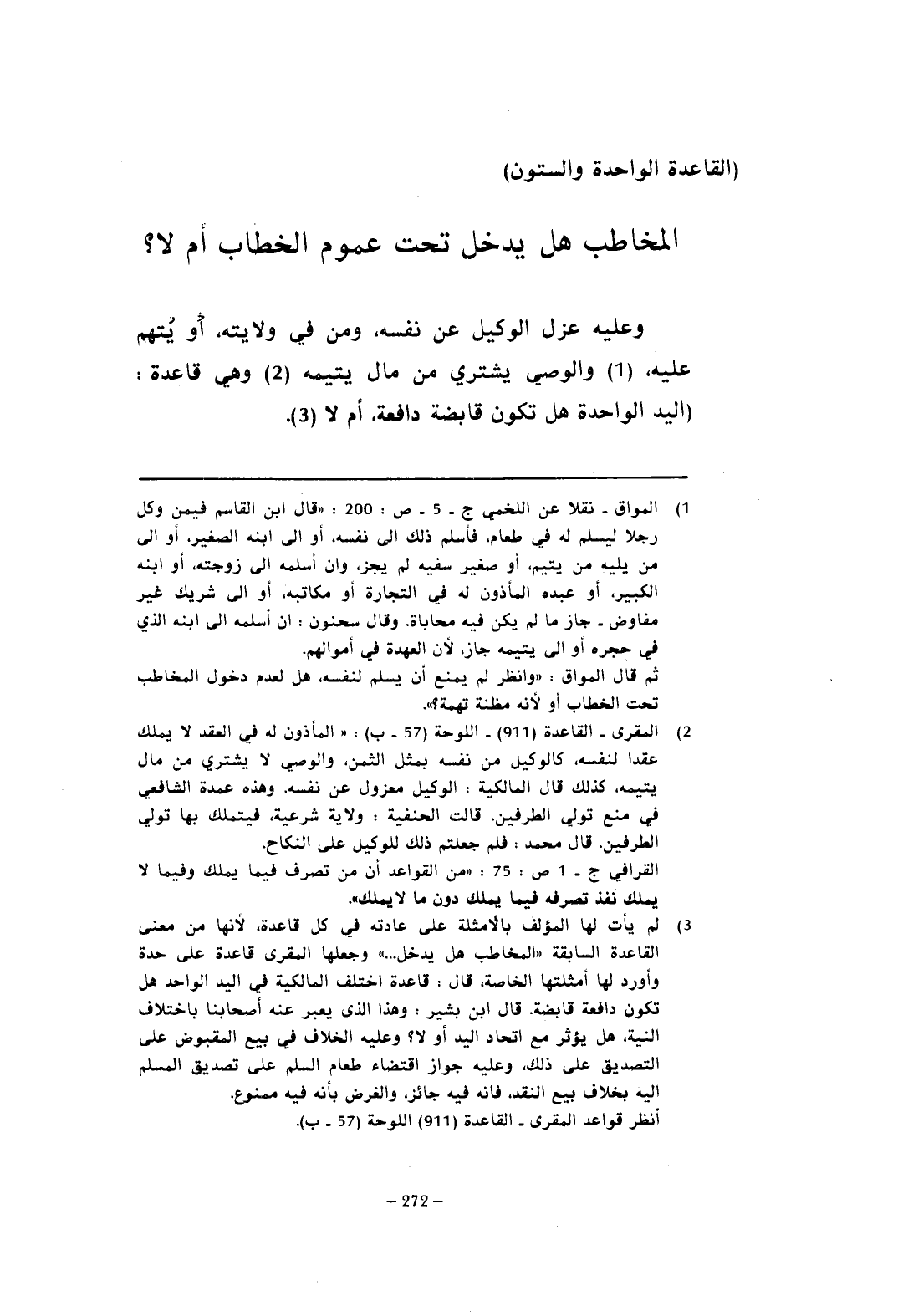 (¬2) المقري- القاعدة (961) - اللوحة (57 - ب): "المأذون له في العقد لا يملك عقدا لنفسه، كالوكيل من نفسه بمثل الثمن، والوصي لا يشتري من مال يتيمه، كذلك قال المالكية: الوكيل معزول عن نفسه. وهذه عمدة الشافعي في منع تولي الطرفين. قالت الحنفية: ولاية شرعية، ليتملك بها تولي الطرفين. قال محمد: فلم جعلتم ذلك للوكيل على النكاح.