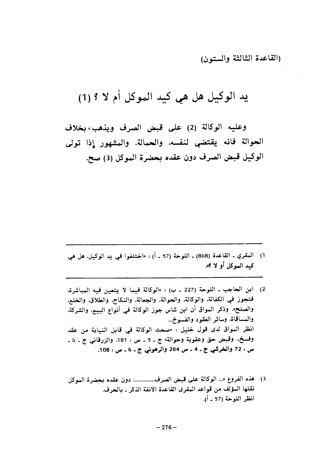(¬3) هذه الفروع " ... الوكالة على قبض الصرف. . . ... دون عقده بحضرة الموكل نقلها المؤلف من قواعد المقري القاعدة الآنفة الذكر- بالحرف.