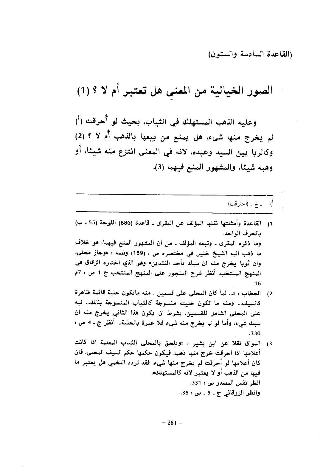 (¬3) المواق نقلا عن ابن بشير: "ويلحق بالمحلى الثياب المعلمة إذا كانت أعلامها إذا أحرقت خرج منها ذهب. فيكون حكمها حكم السيف المحلى، فإن كان أعلامها لو أحرقت لم يخرج منها شيء، فقد تردد اللخمي هل يعتبر ما فيها من الذهب أو لا يعتبر لأنه كالمستهلك".