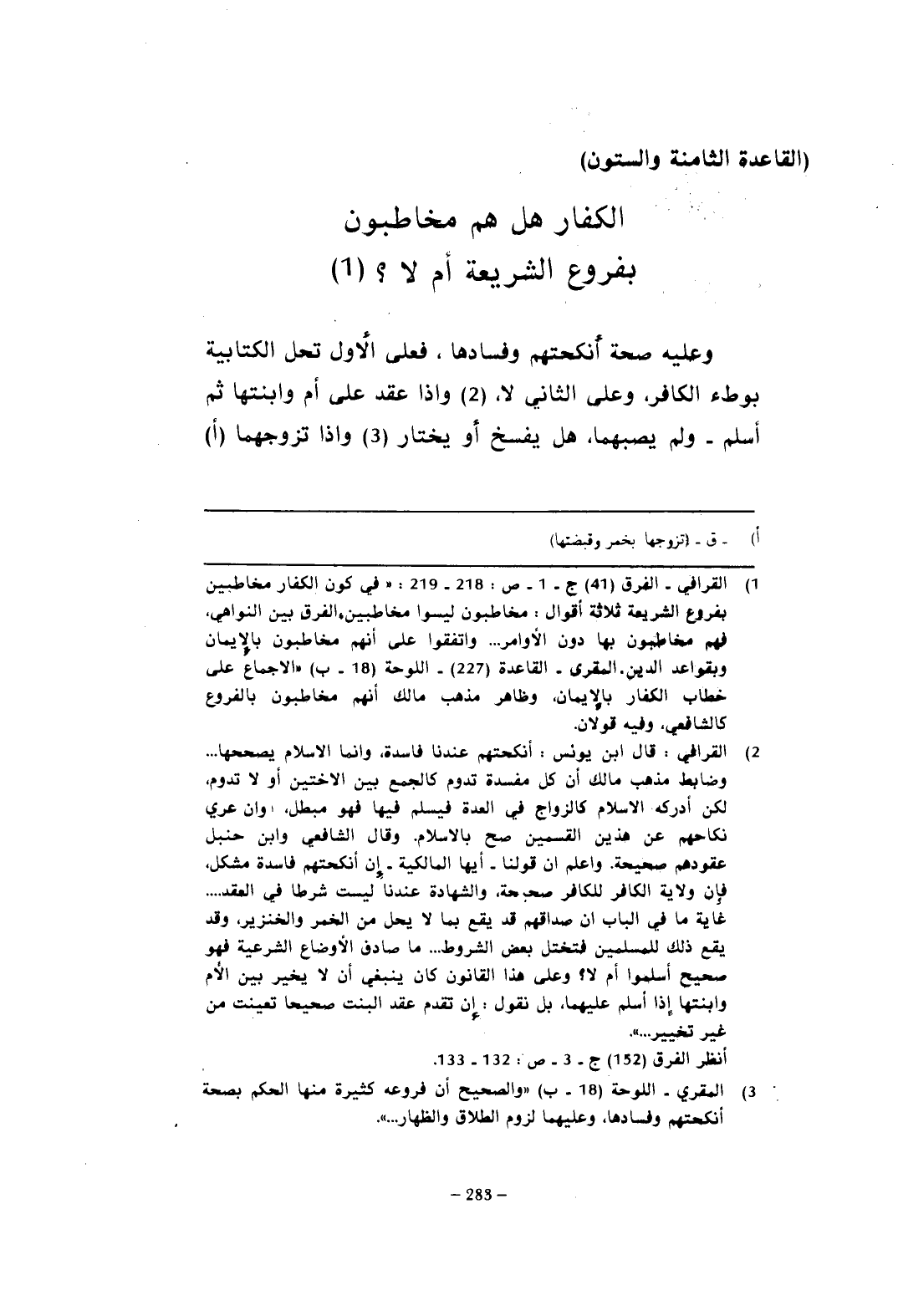 (¬1) القرافي- الفرق (46) ج- 1 - ص: 218 - 219: "في كون الكفار مخاطبين بفروع الشريعة ثلاثة أقوال: مخاطبون ليسوا مخاطبين, الفرق بين النواهي، فهم مخاطبون بها دون الأوامر ... واتفقوا على أنهم مخاطبون بالإيمان وبقواعد الدين -المقري- القاعدة (227) - اللوحة (18 - ب) "الإجماع على خطاب الكفار بالإيمان، وظاهر مذهب مالك أنهم مخاطبون بالفروع كالشافعي, وفيه قولان.