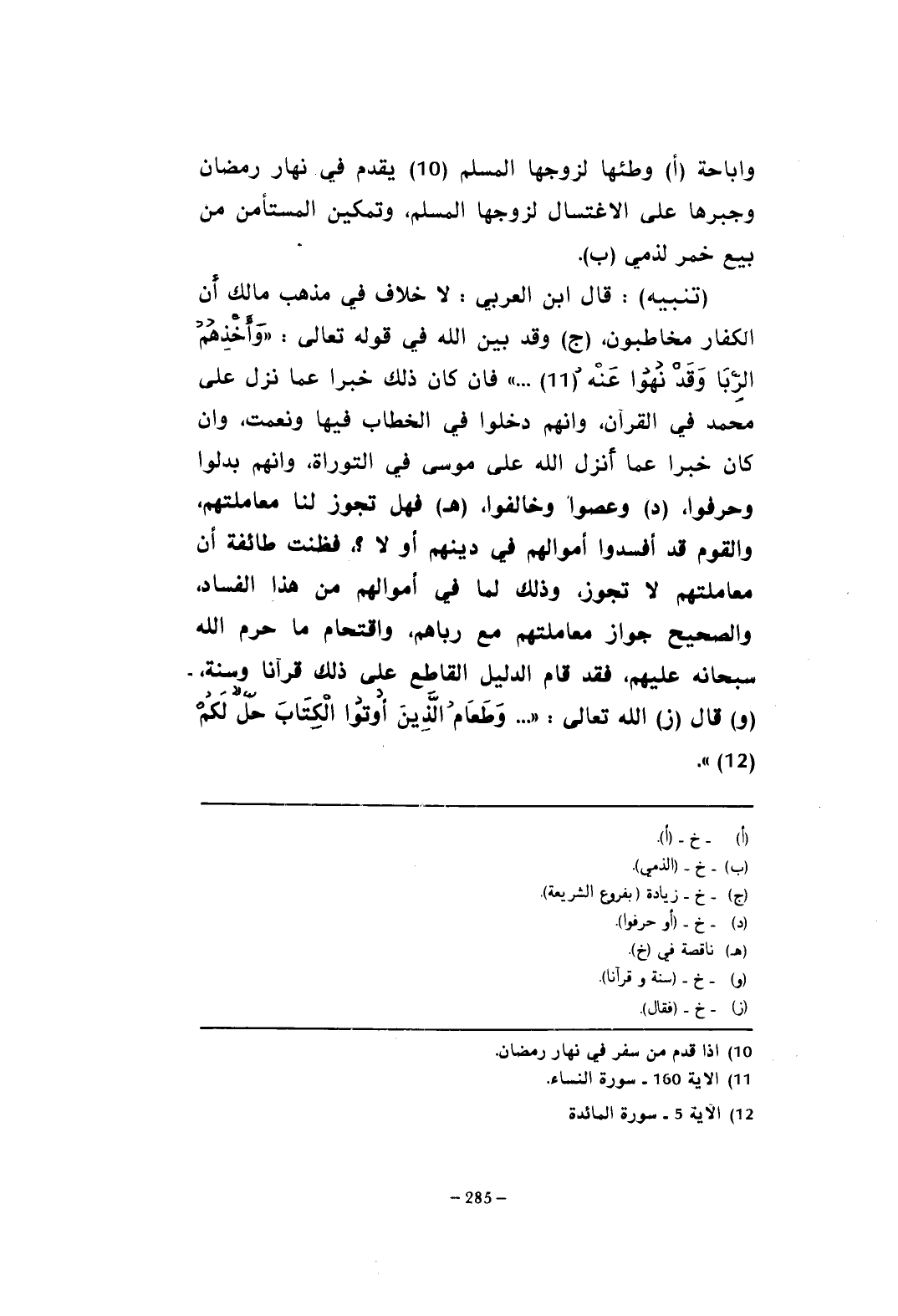 وإباحة (أ) وطئها لزوجها المسلم (¬10) يقدم في نهار رمضان وجبرها على الاغتسال لزوجها المسلم، وتمكين المستأمن من بيع خمر لذمي (ب).