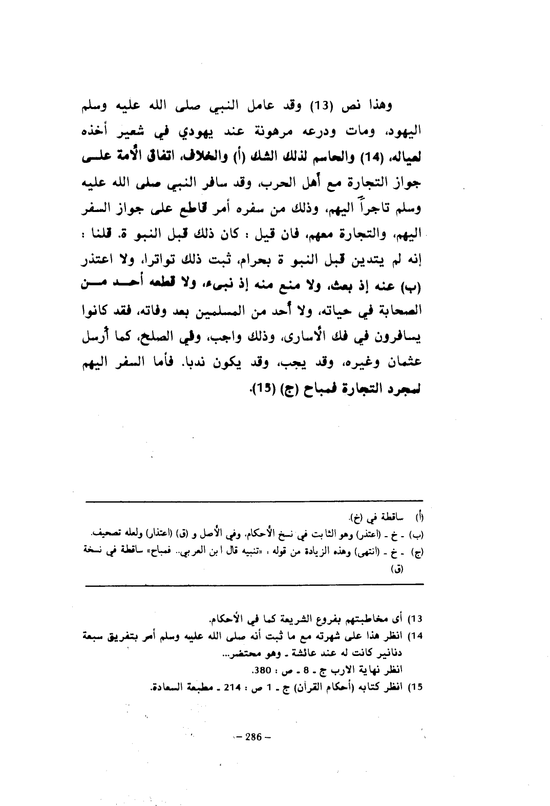 وهذا نص (¬13) وقد عامل النبي صلى الله عليه وسلم اليهود، ومات ودرعه مرهونة عند يهودي في شعير أخذه لعياله، (¬14) والحاسم لذلك الشك (أ) والخلاف، اتفاق الأمة على جواز التجارة مع أهل الحرب، وقد سافر النبي صلى الله عليه وسلم تاجرًا إليهم، وذلك من سفره أمر قاطع على جواز السفر إليهم، والتجارة معهم، فإن قيل: كان ذلك قبل النبوة. قلنا: إنه لم يتدين قبل النبوة بحرام، ثبت ذلك تواترا، ولا اعتذر (ب) عنه إذ بعث، ولا منع منه إذ نبيء، ولا قطعه أحد من الصحابة في حياته، ولا أحد من المسلمين بعد وفاته، فقد كانوا يسافرون في فك الأسارى، وذلك واجب، وفي الصلح، كما أرسل عثمان وغيره، وقد يجب، وقد يكون ندبا. فأما السفر إليهم لمجرد التجارة فمباح (ج) (¬15).
