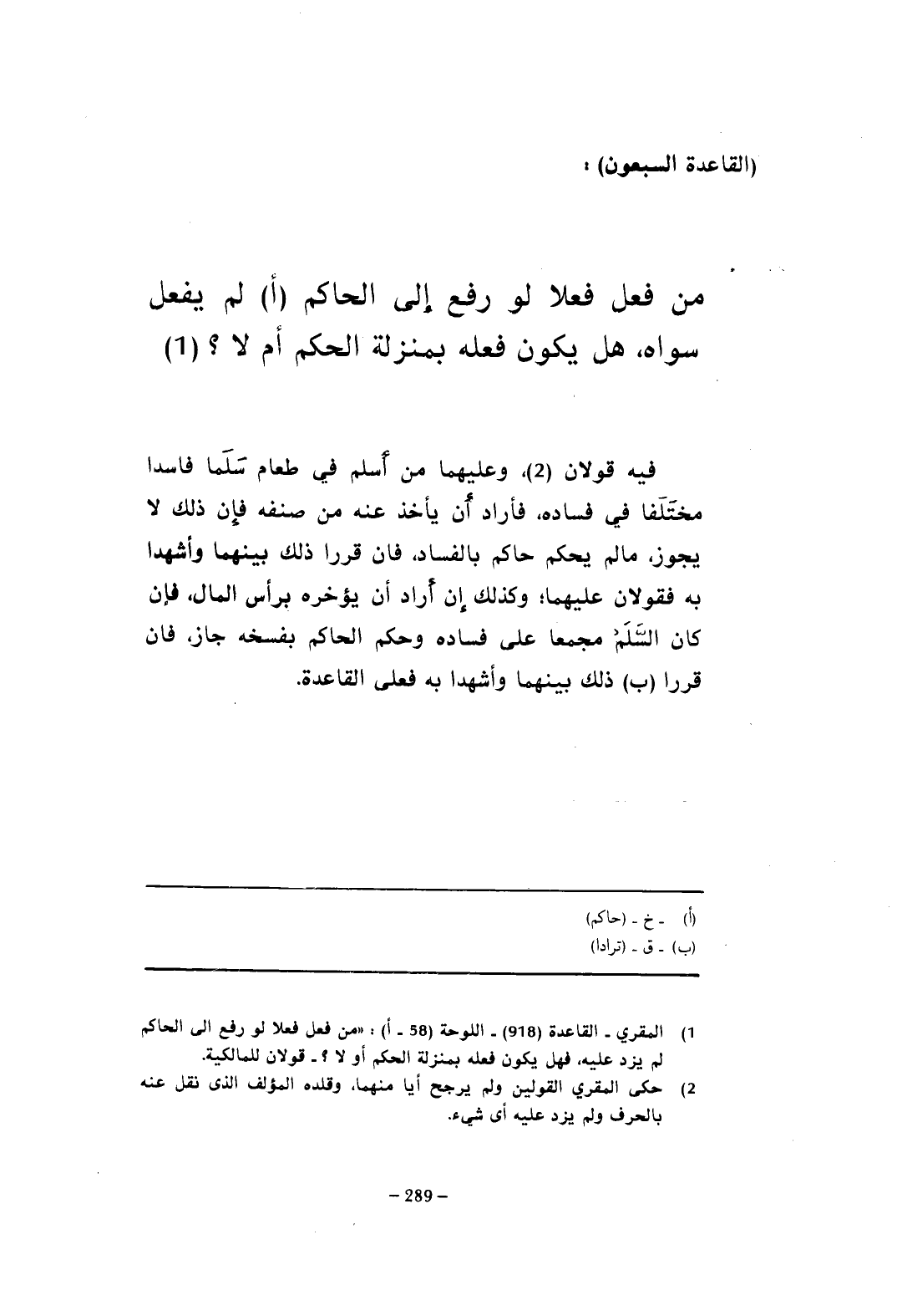 (¬1) المقري- القاعدة (918) - اللوحة (58 - أ): "من فعل فعلا لو رفع إلى الحاكم لم يزد عليه، فهل يكون فعله بمنزلة الحكم أو لا؟ - قولان للمالكية.