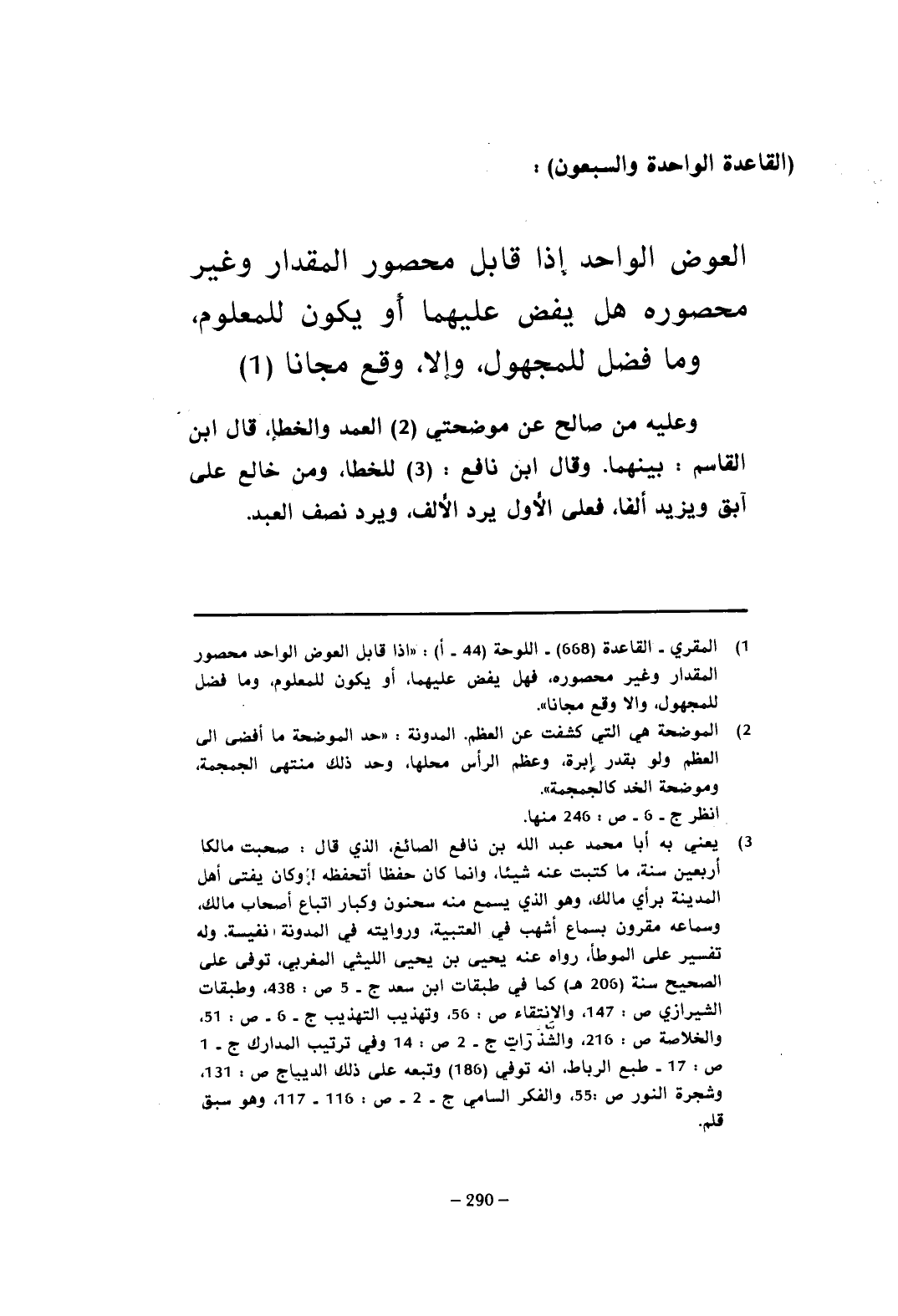 (¬1) المقري- القاعدة (558) - اللوحة (44 - أ): "إذا قابل العوض الواحد محصور المقدار وغير محصوره، فهل يفض عليهما، أو يكون للمعلوم، وما فضل للمجهول، وإلا وقع مجانا".