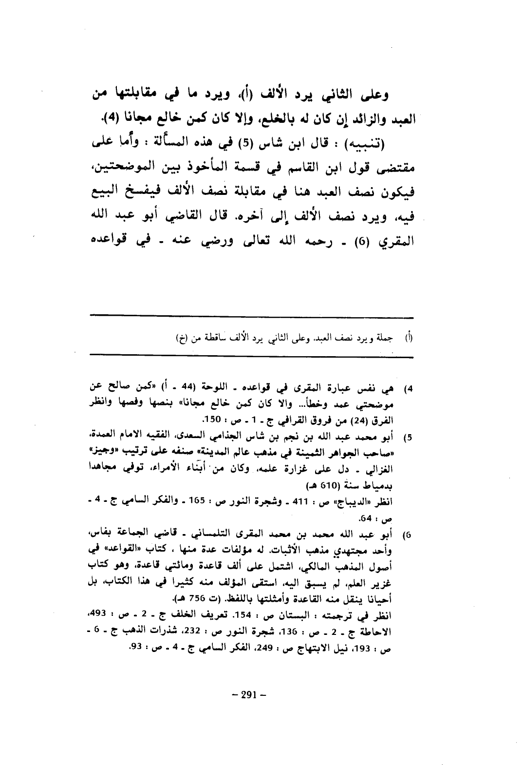 (¬6) أبو عبد الله محمد بن محمد المقري التلمساني- قاضي الجماعة بفاس، وأحد مجتهدي مذهب الأثبات. له مؤلفات عدة منها، كتاب "القواعد" في أصول المذهب المالكي، اشتمل على ألف قاعدة ومائتي قاعدة، وهو كتاب غزير العلم، لم يسبق إليه، استقى المؤلف منه كثيرا في هذا الكتاب، بل أحيانا ينقل منه القاعدة وأمثلتها باللفظ. (ت 756 هـ).