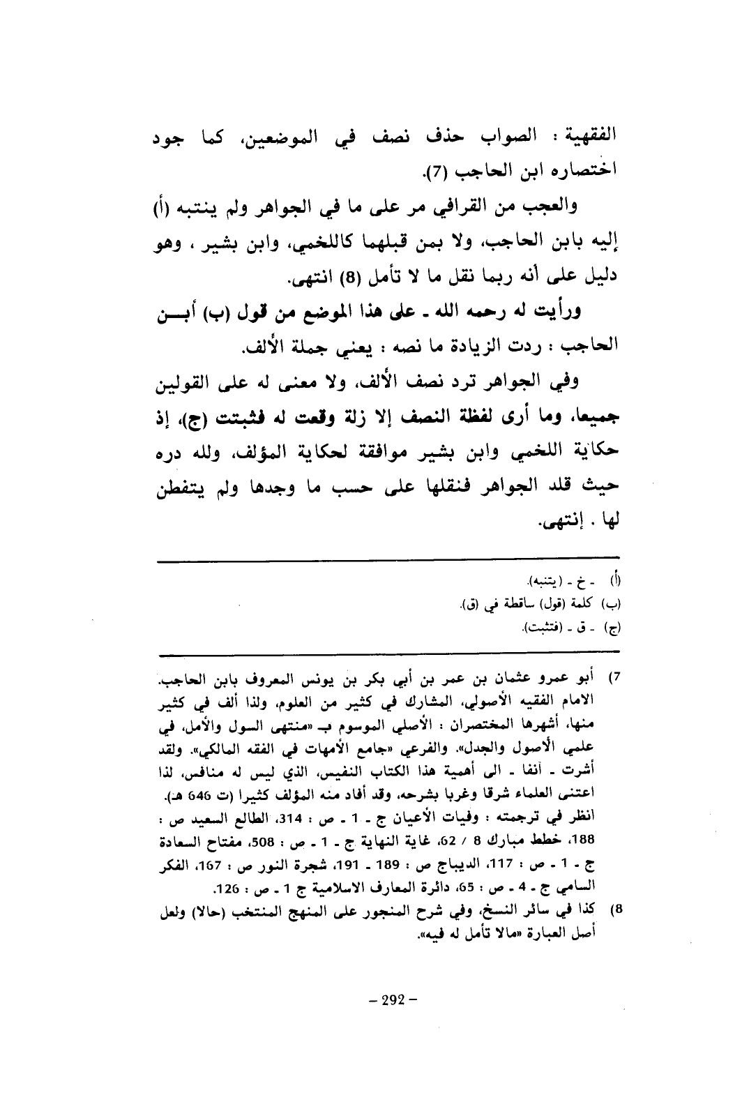 (¬7) أبو عمرو عثمان بن عمر بن أبي بكر بن يونس المعروف بابن الحاجب. الإمام الفقيه الأصولي، المشارك في كثير من العلوم، ولذا ألف في كثير منها، أشهرها المختصران: الأصلي الموسوم بـ "منتهى السول والأمل، في علمي الأصول والجدل". والفرعي "جامع الأمهات في الفقه المالكي". ولقد أشرت -آنفا- إلى أهمية هذا الكتاب النفيس، الذي ليس له منافس، لذا اعتنى العلماء شرقا وغربا بشرحه، وقد أفاد منه المؤلف كثيرا (ت 646 هـ). انظر في ترجمته: وفيات الأعيان ج- 1 - ص: 314، الطالع السعيد ص: 188، خطط مبارك 8/ 62، غاية النهاية ج- 1 - ص: 508، مفتاح السعادة ج- 1 - ص: 117، الديباج ص: 189 - 191، شجرة النور ص: 167، الفكر السامي ج- 4 - ص: 65، دائرة المعارف الإسلامية ج 1 - ص: 126.