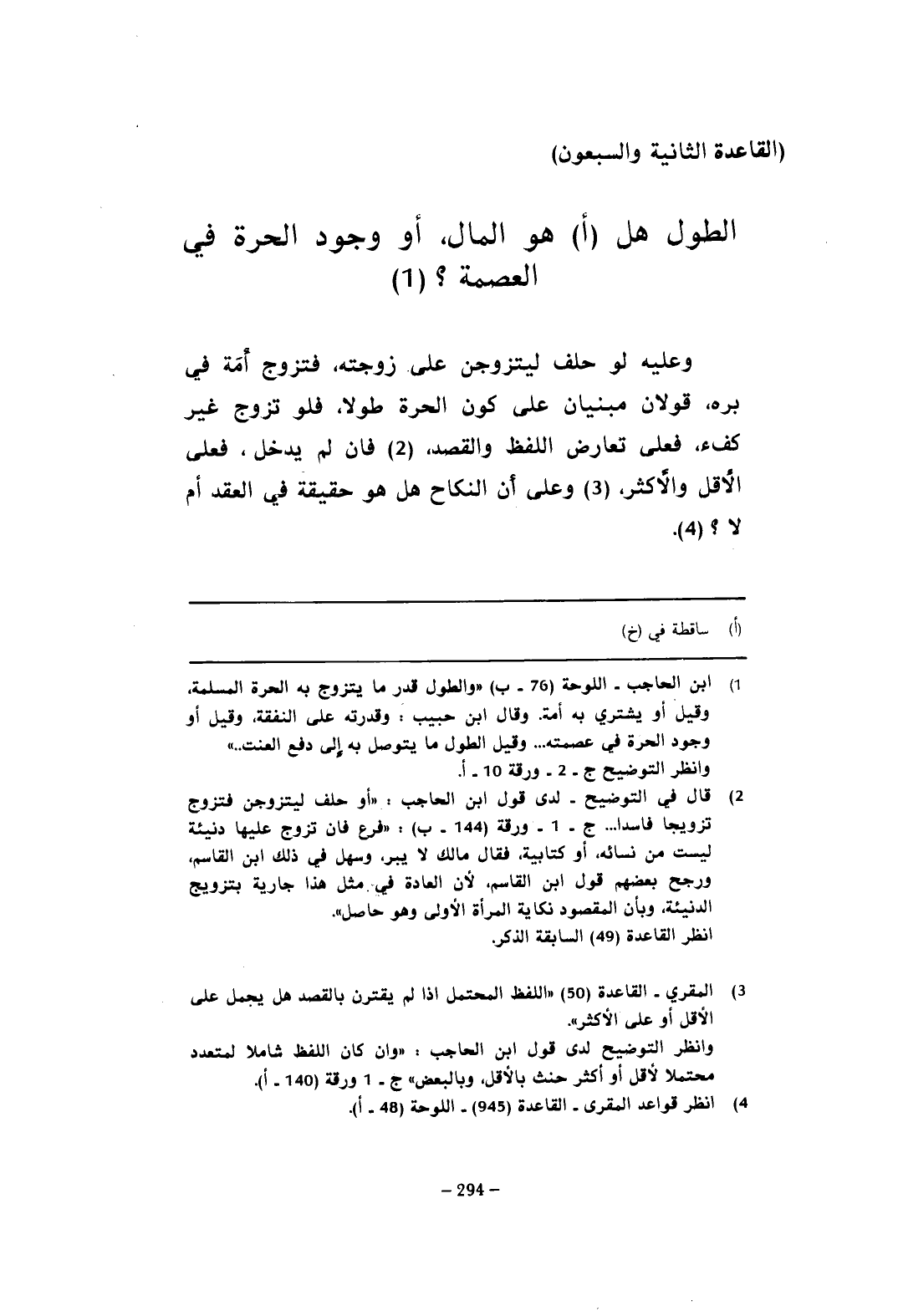 (القاعدة الثانية والسبعون) الطول هل (أ) هو المال، أو وجود الحرة في العصمة؟ (¬1)
