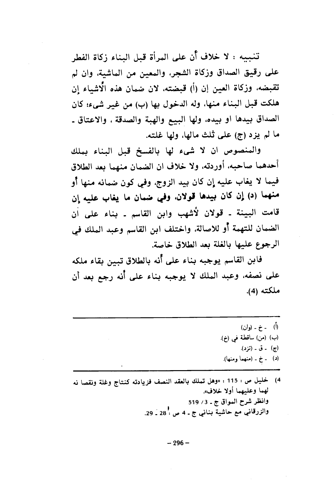 تنبيه: لا خلاف أن على المرأة قبل البناء زكاة الفطر على رقيق الصداق وزكاة الشجر، والمعين من الماشية، وإن لم تقبضه، وزكاة العين إن (أ) قبضته، لأن ضمان هذه الأشياء إن هلكت قبل البناء منها، وله الدخول بها (ب) من غير شيء؛ كان الصداق بيدها أو بيده، ولها البيع والهبة والصدقة، والإعتاق- ما لم يزد (ج) على ثلث مالها، ولها غلته.