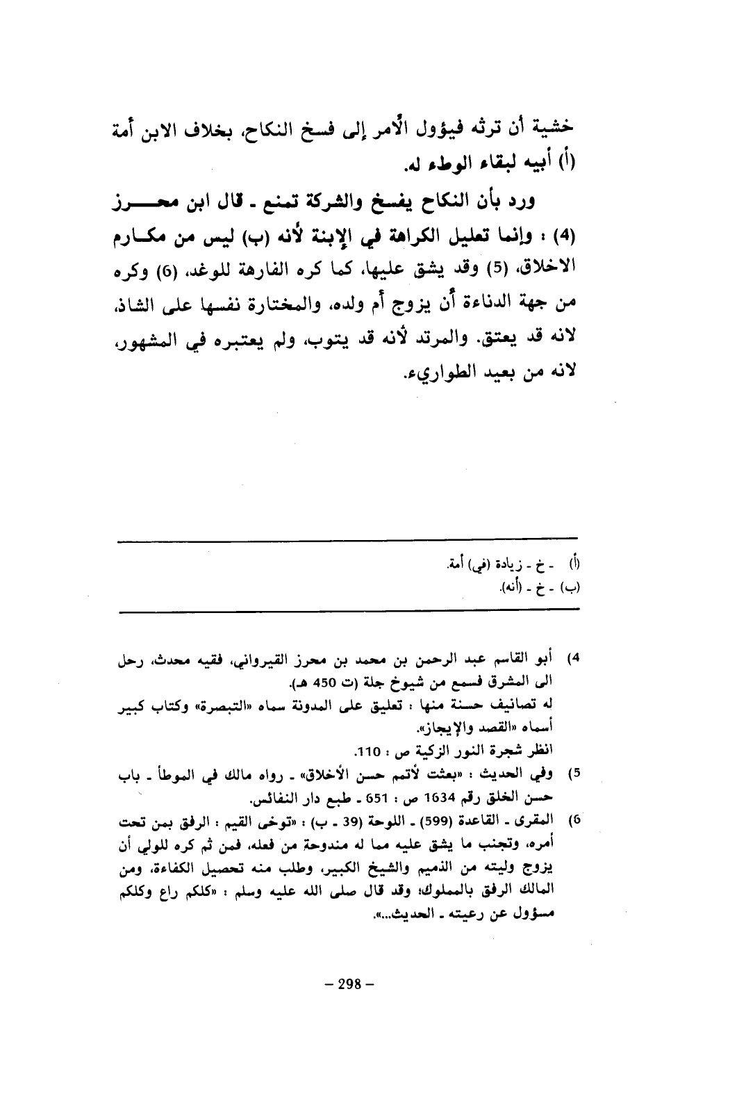(¬6) المقري - القاعدة (599) - اللوحة (39 - ب): "توخى القيم: الرفق بمن تحت أمره، وتجنب ما يشق عليه مما له مندوحة من فعله، فمن ثم كره للولي أن يزوج وليته من الذميم والشيخ الكبير، وطلب منه تحصيل الكفاءة، ومن المالك الرفق بالمملوك؛ وقد قال صلى الله عليه وسلم: "كلكم راع وكلكم مسؤول عن رعيته- الحديث ... ".