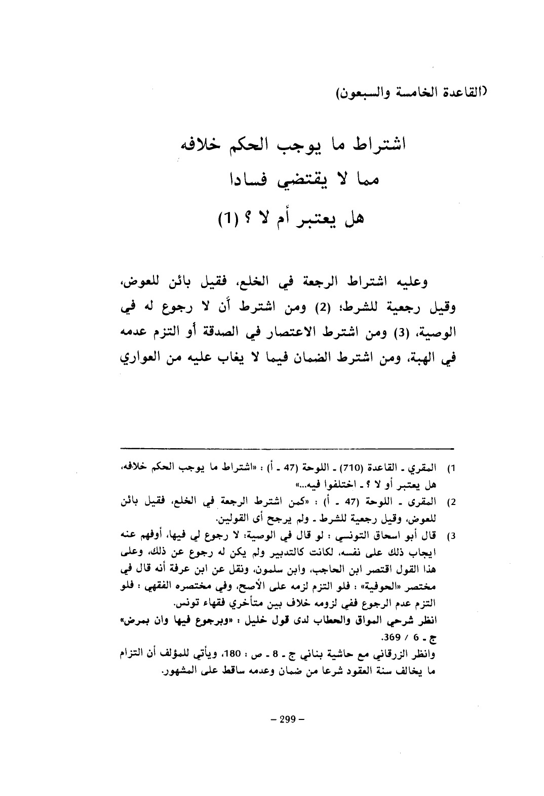 (¬1) المقري- القاعدة (710) - اللوحة (47 - أ): "اشتراط ما يوجب الحكم خلافه، هل يعتبر أو لا؟ - اختلفوا فيه ... ".