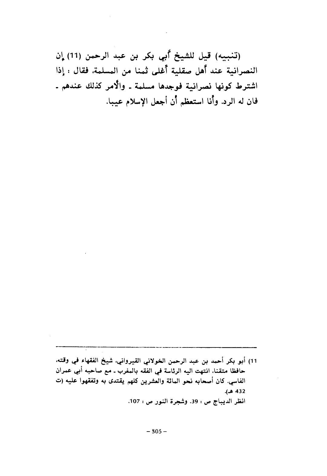 (تنبيه) قيل للشيخ أبي بكر بن عبد الرحمن (¬11) إن النصرانية عند أهل صقلية أغلى ثمنا من المسلمة، فقال: إذا اشترط كونها نصرانية فوجدها مسلمة - والأمر كذلك عندهم - فإن له الرد. وأنا استعظم أن أجعل الإسلام عيبا.